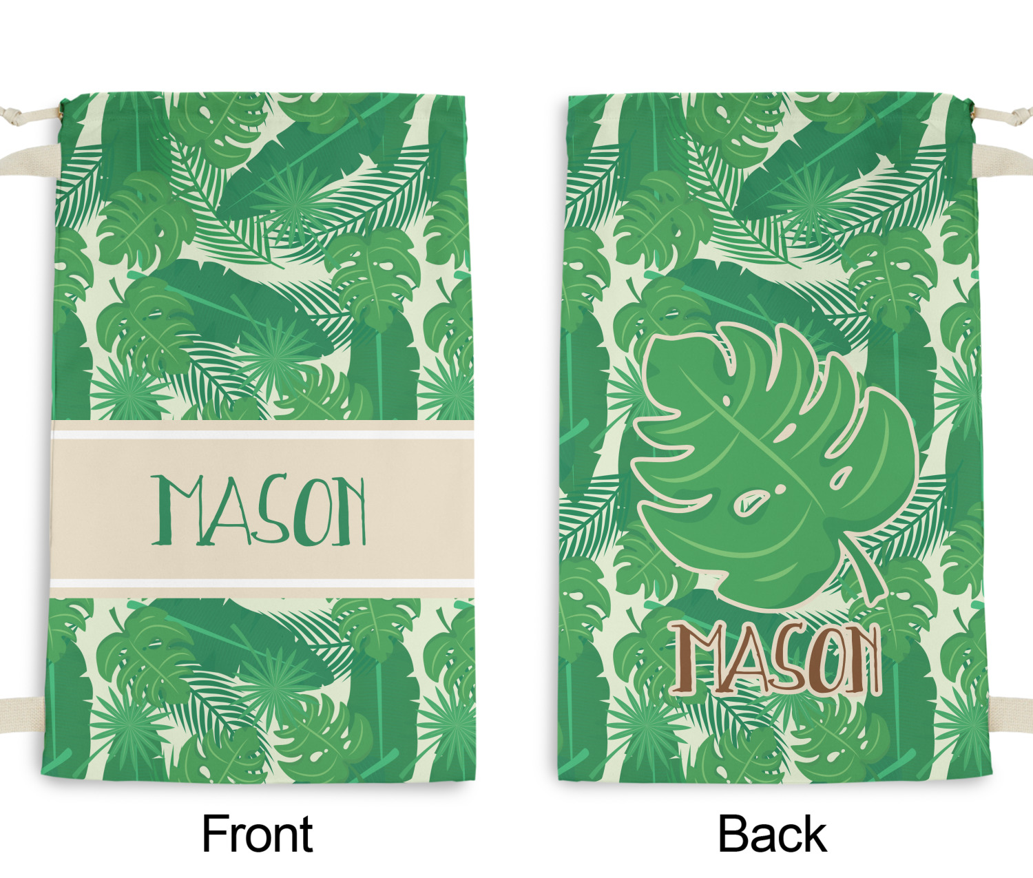 The main design has a cream background with bright green tropical leaves faces every which way. Through the middle of the design sits a cream ribbon, with your personalization on the ribbon itself. Several different kinds of tropical leaves are featured in this fun design.