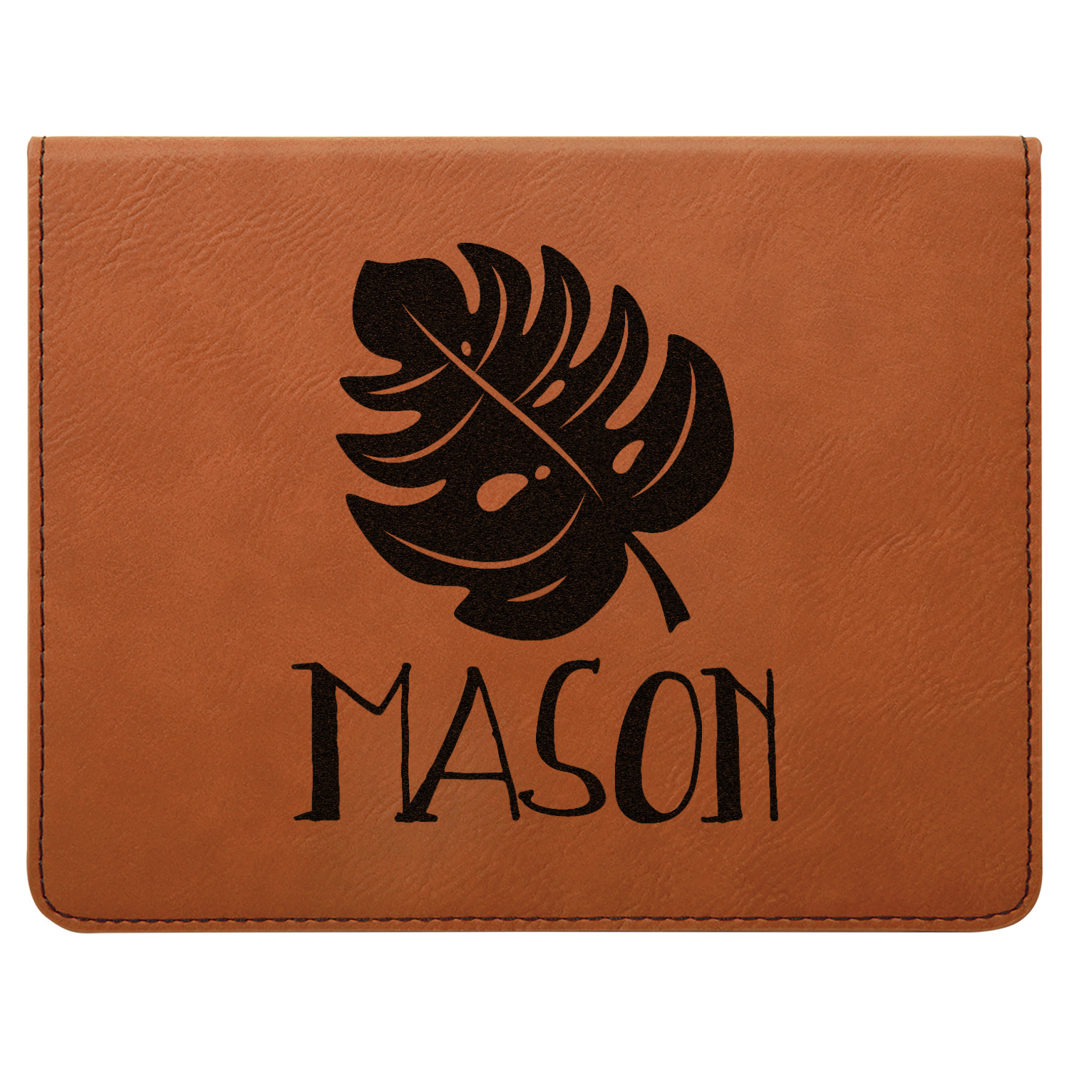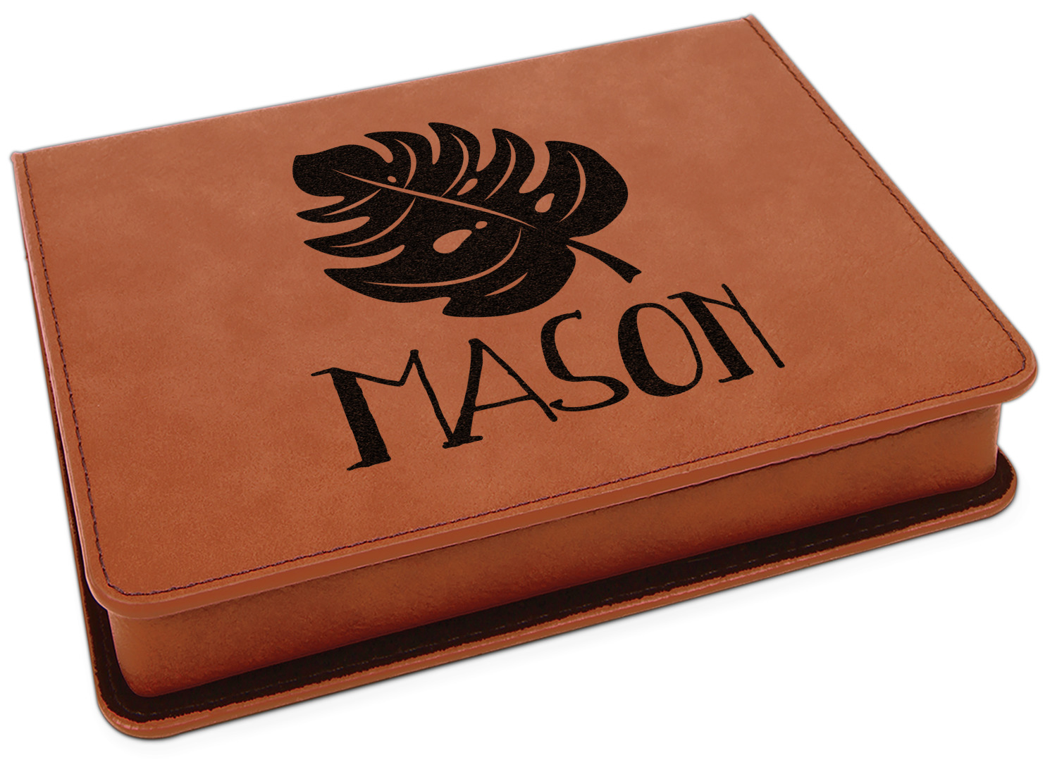 The main design has a cream background with bright green tropical leaves faces every which way. Through the middle of the design sits a cream ribbon, with your personalization on the ribbon itself. Several different kinds of tropical leaves are featured in this fun design.
