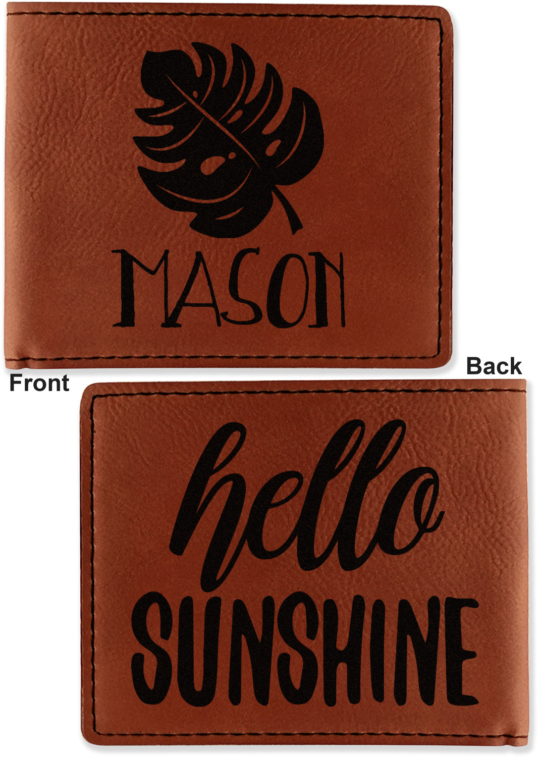 Your bifold wallet will be personalized by laser engraving, which will be a black color on the wallet. Choose a graphic, text, or monogram to personalize your wallet. There are thousands of choices in our design center.