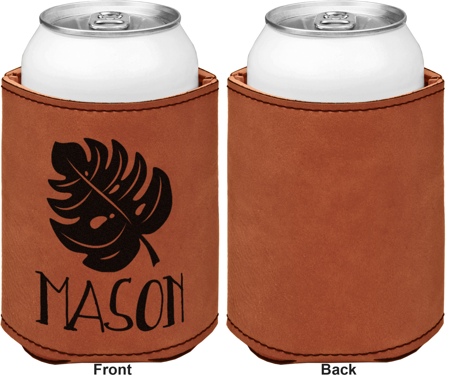 This can sleeve is made from a cognac-brown leatherette and stitched with a sturdy, black thread. A slim padding lines the inside of your can sleeve to allow for a better fit once your drink is inserted. The sleeve itself measures at 4 by 4.5 inches, allowing this custom can sleeve to accommodate most canned drinks. Your personalized design can be engraved on the front and back, or solely the front. When laser-engraved, your design appears as a black coloration which contrasts the leatherette nicely.