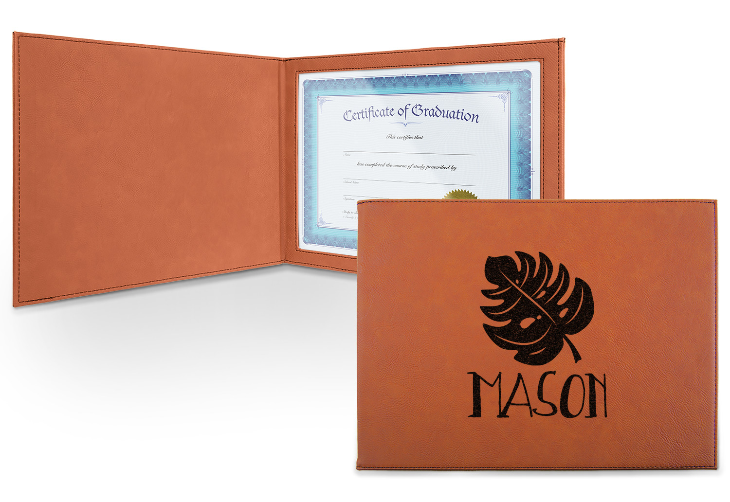 This cognac-colored, leatherette certificate jacket is the ideal way to display or store your hard-earned certificate. When closed, the custom certificate holder measures at 12 by 9 inches. The interior of the certificate cover includes a clear, vinyl window to encase your diploma. The window measures at around 10.5 by 7.5 inches and can accommodate a diploma that measures at up to 8.5 by 11 inches. You can either choose to have your customization laser engraved on the front and interior, or solely the front.