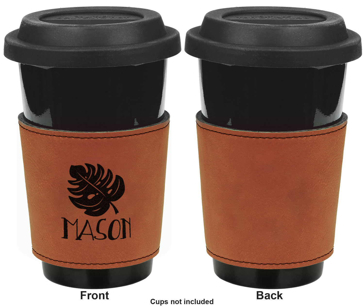 This cup sleeve is made from a suave, cognac-brown leatherette and finished with an intricate, black stitch. The interior of this can sleeve is fabricated from a thin foam material to help insulate your mug's contents. The sleeve is specifically made to suit tapered glasses or mugs, so the top's diameter is 3.5 inches, while the bottom's diameter is 2.75 inches. Your customized design will be laser engraved into the leatherette, leaving behind crisp, black imprint. With these products, we provide you with the option of engraving the front and back, or the front only.