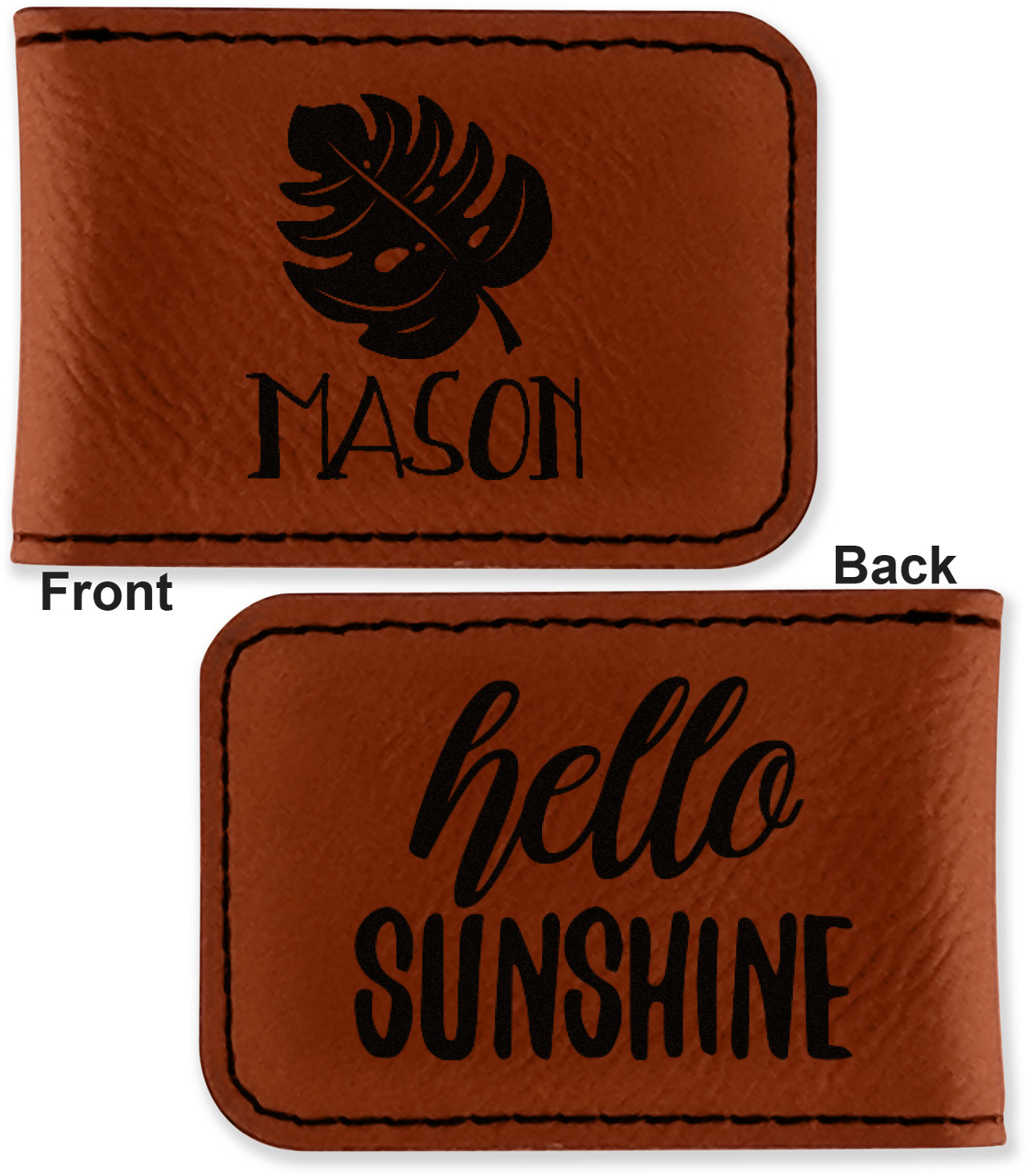 Your money clip will be laser engraved so that the design you choose will come out black. Find a fun graphic, monogram, or font to use to personalize your money clip either on just the front or the front and the back.