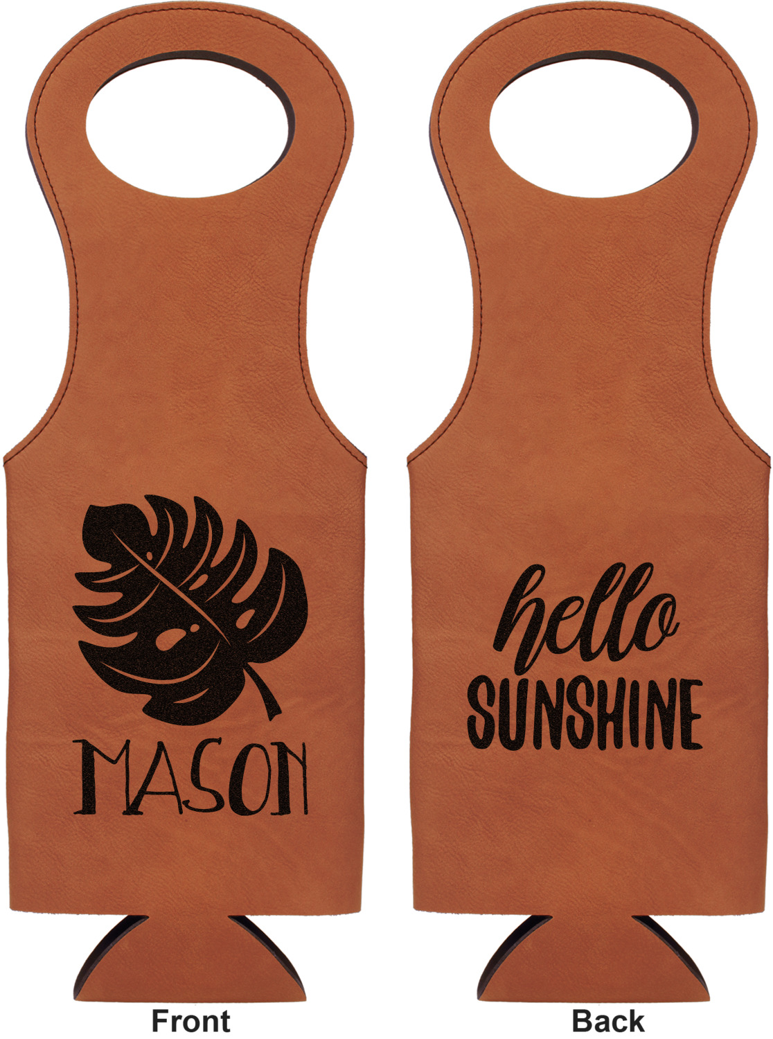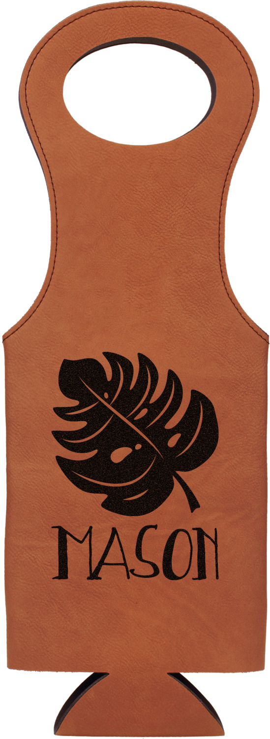 This wine carrier is made from a stunning leatherette, in a cognac-brown color. Strong, black stitching lines the sides of your wine bottle bag and provides extra durability. The interior is lined with a padded, black material to allow for a snug fit once your bottle is placed inside. At the top of this wine gift bag, you'll find two oval shaped handles that elegantly complements the rest of the bag's style. We provide you with the option of laser-engraving the front, or the front and back of your new personalized wine bag!