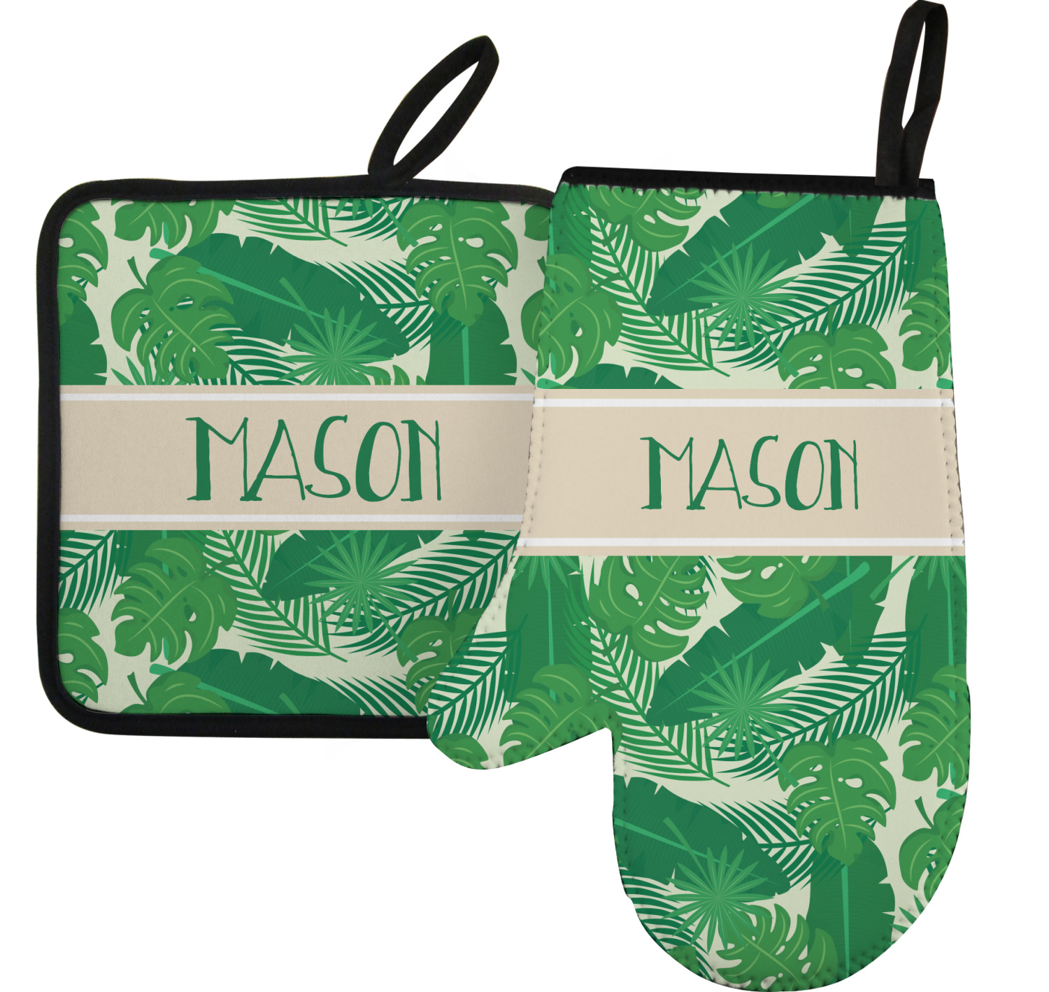 The main design has a cream background with bright green tropical leaves faces every which way. Through the middle of the design sits a cream ribbon, with your personalization on the ribbon itself. Several different kinds of tropical leaves are featured in this fun design.