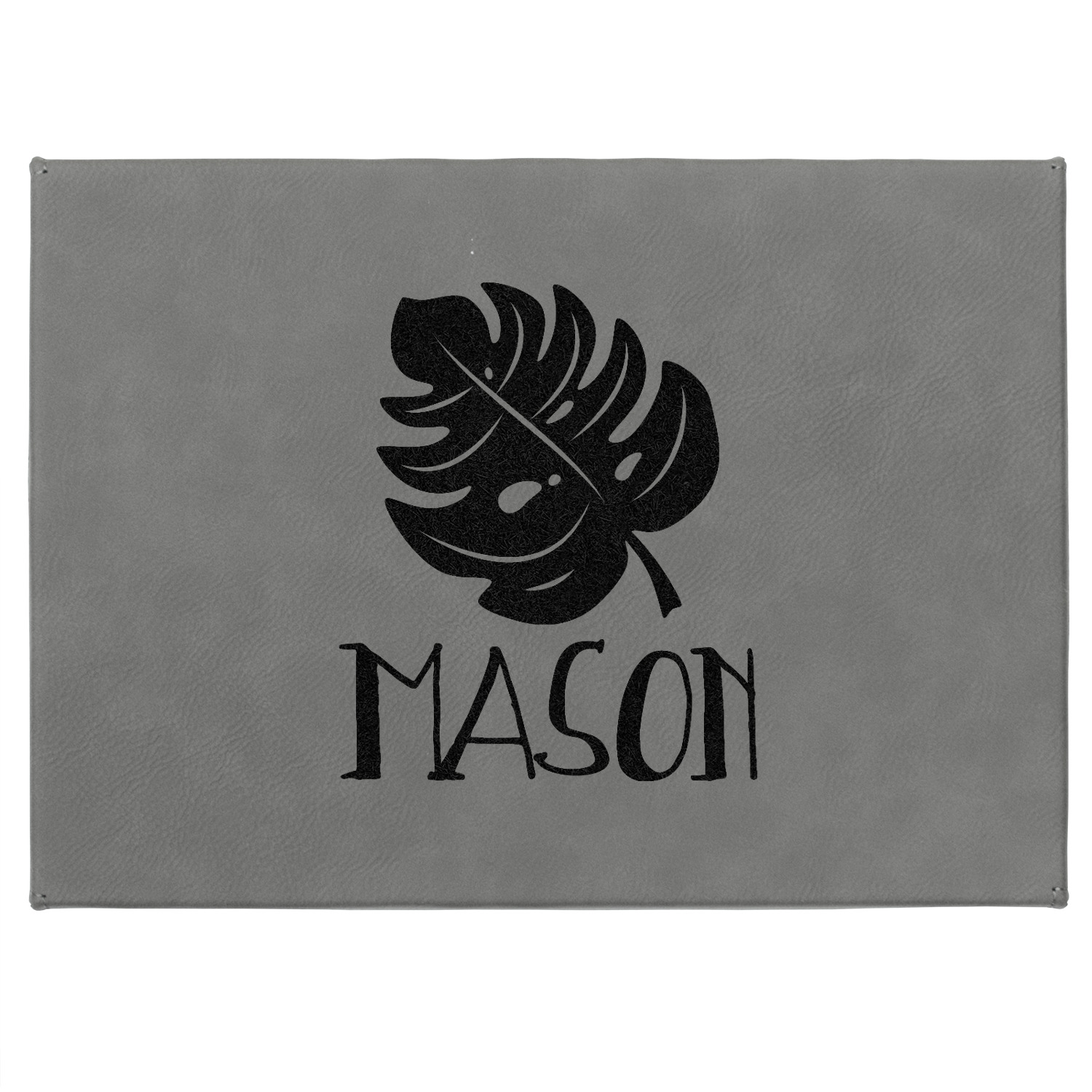 The main design has a cream background with bright green tropical leaves faces every which way. Through the middle of the design sits a cream ribbon, with your personalization on the ribbon itself. Several different kinds of tropical leaves are featured in this fun design.