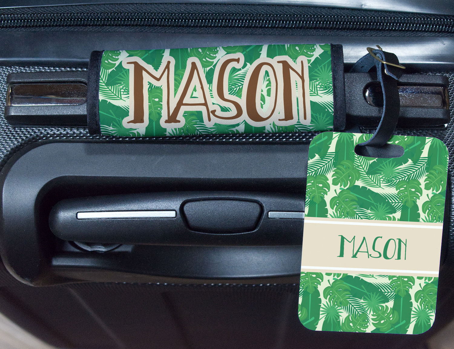The main design has a cream background with bright green tropical leaves faces every which way. Through the middle of the design sits a cream ribbon, with your personalization on the ribbon itself. Several different kinds of tropical leaves are featured in this fun design.