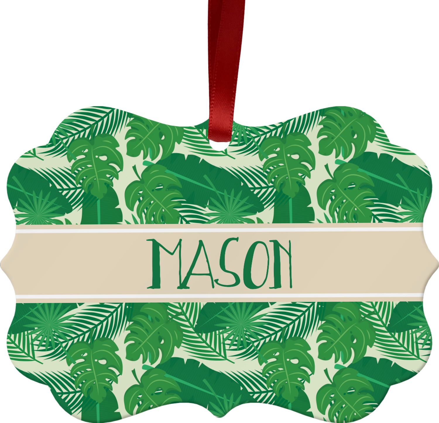 The main design has a cream background with bright green tropical leaves faces every which way. Through the middle of the design sits a cream ribbon, with your personalization on the ribbon itself. Several different kinds of tropical leaves are featured in this fun design.