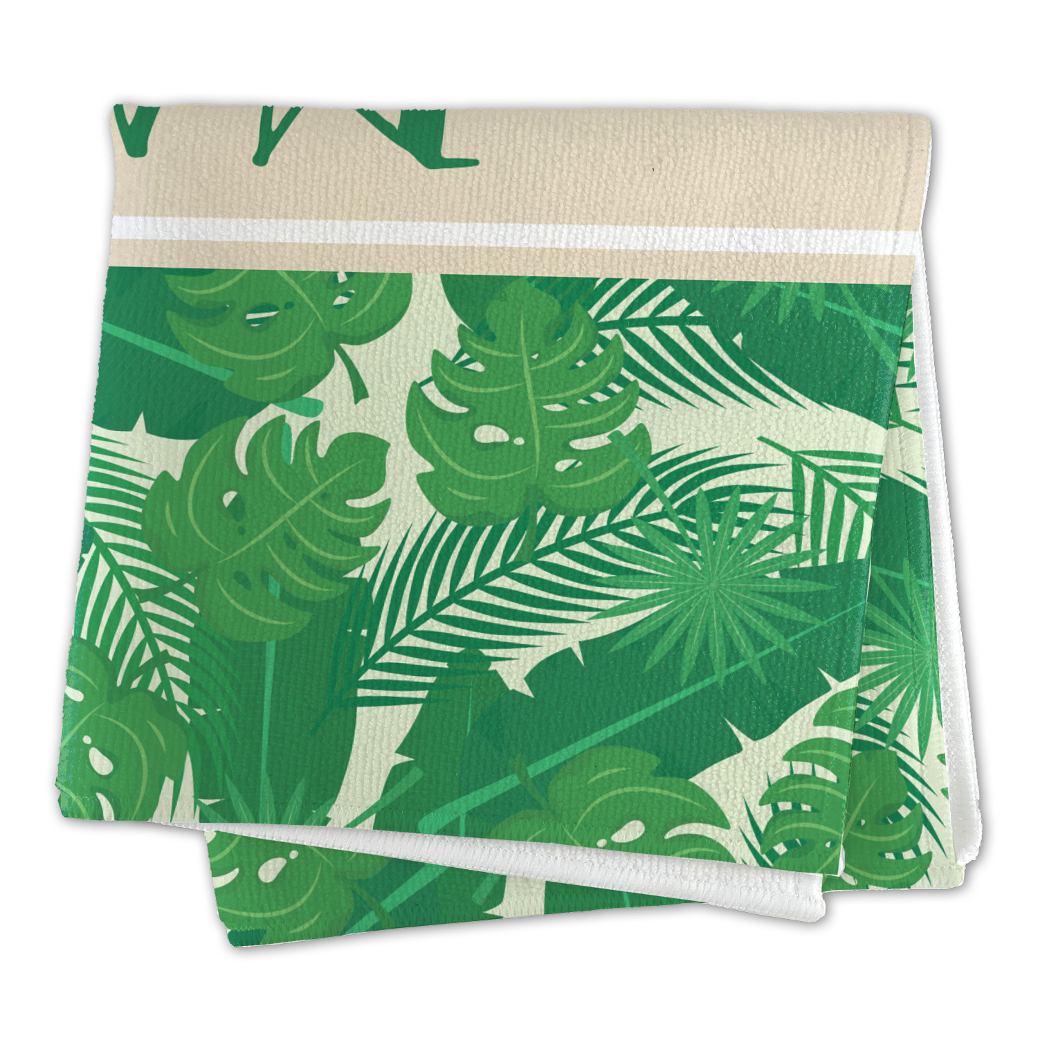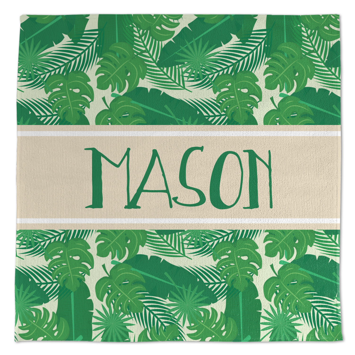The main design has a cream background with bright green tropical leaves faces every which way. Through the middle of the design sits a cream ribbon, with your personalization on the ribbon itself. Several different kinds of tropical leaves are featured in this fun design.