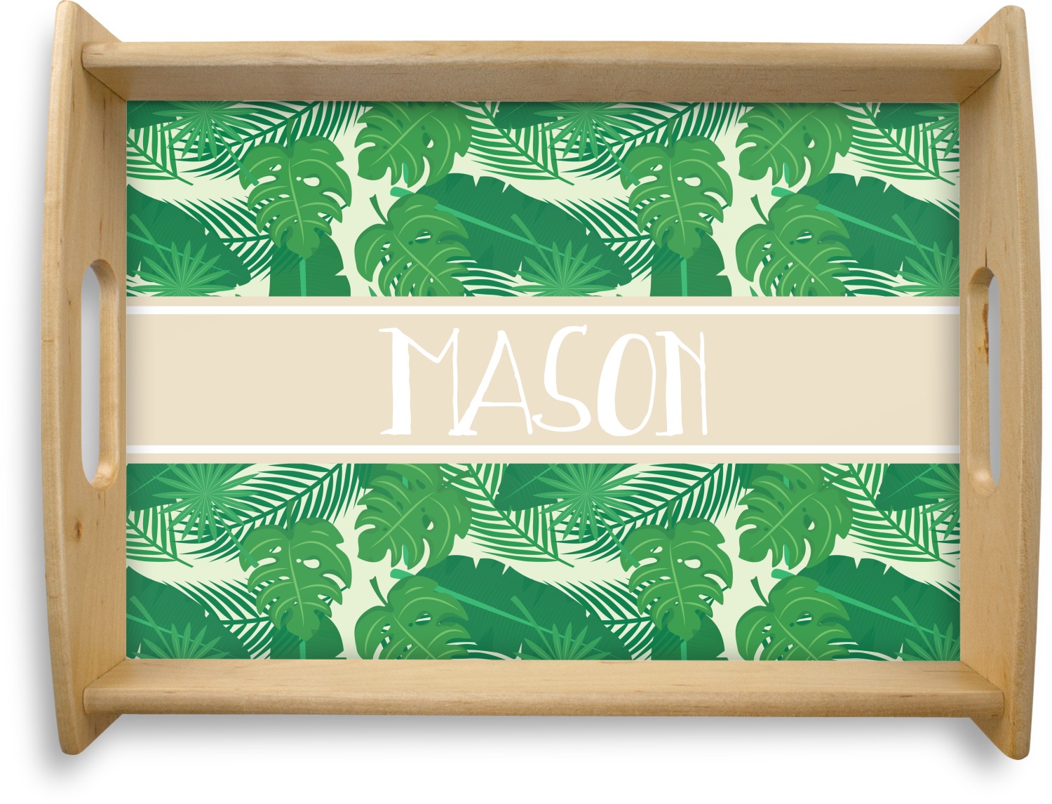The main design has a cream background with bright green tropical leaves faces every which way. Through the middle of the design sits a cream ribbon, with your personalization on the ribbon itself. Several different kinds of tropical leaves are featured in this fun design.