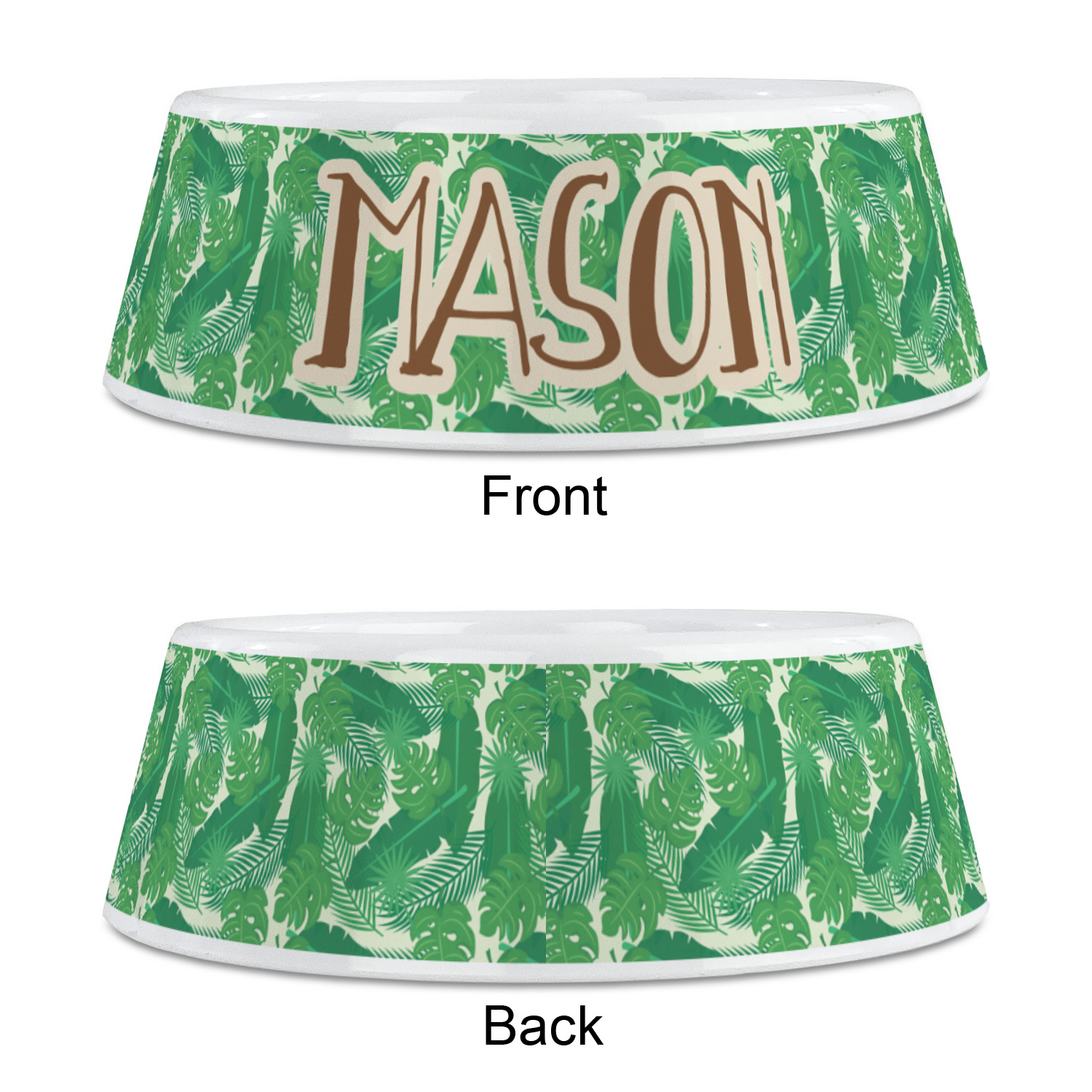 The main design has a cream background with bright green tropical leaves faces every which way. Through the middle of the design sits a cream ribbon, with your personalization on the ribbon itself. Several different kinds of tropical leaves are featured in this fun design.