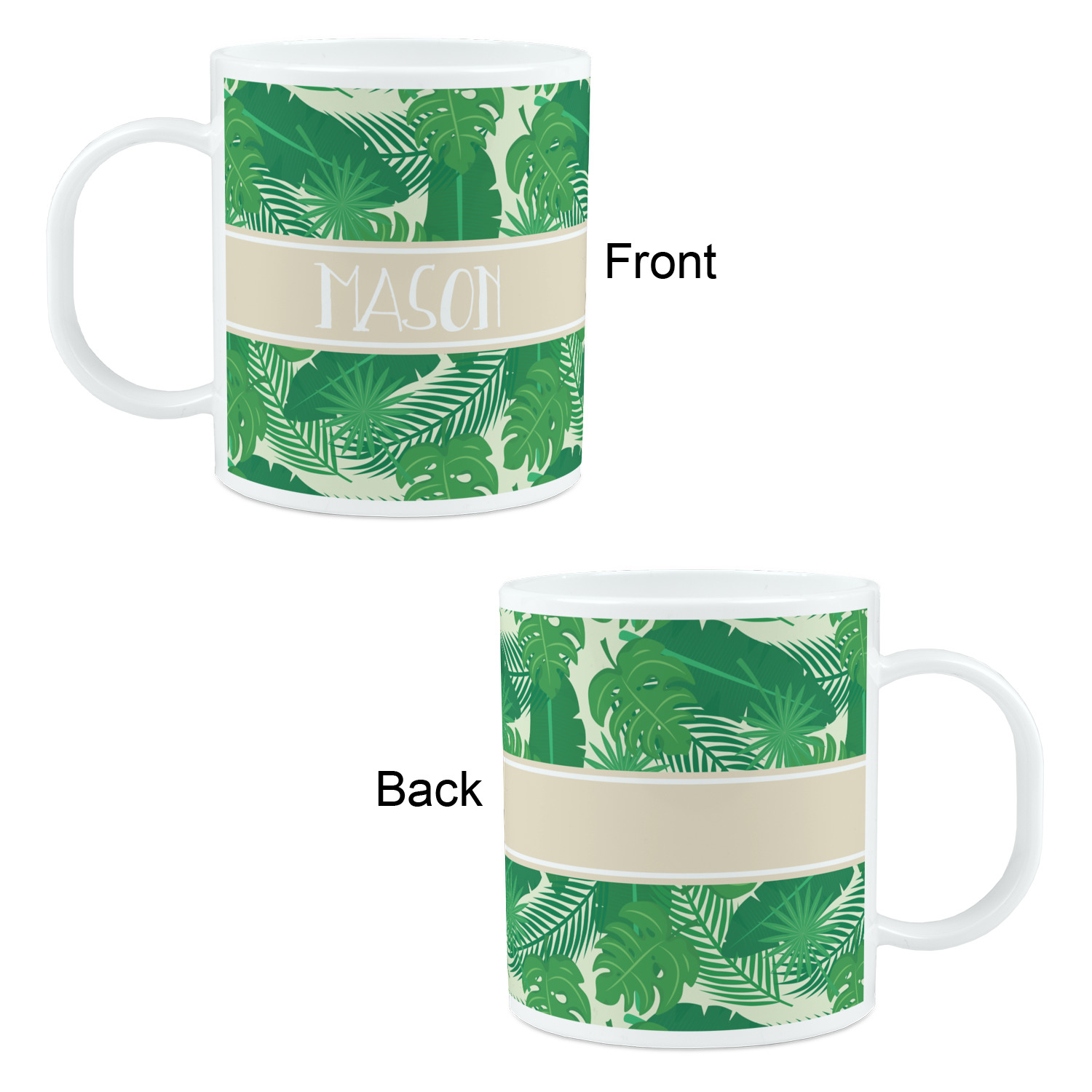 The main design has a cream background with bright green tropical leaves faces every which way. Through the middle of the design sits a cream ribbon, with your personalization on the ribbon itself. Several different kinds of tropical leaves are featured in this fun design.
