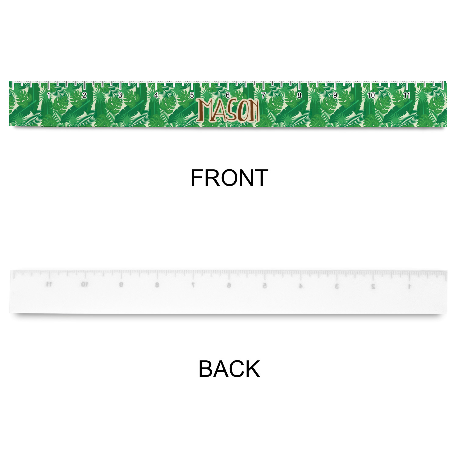 The main design has a cream background with bright green tropical leaves faces every which way. Through the middle of the design sits a cream ribbon, with your personalization on the ribbon itself. Several different kinds of tropical leaves are featured in this fun design.
