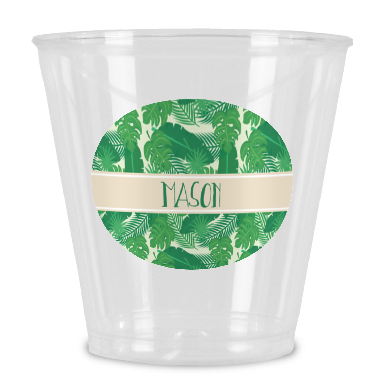 The main design has a cream background with bright green tropical leaves faces every which way. Through the middle of the design sits a cream ribbon, with your personalization on the ribbon itself. Several different kinds of tropical leaves are featured in this fun design.