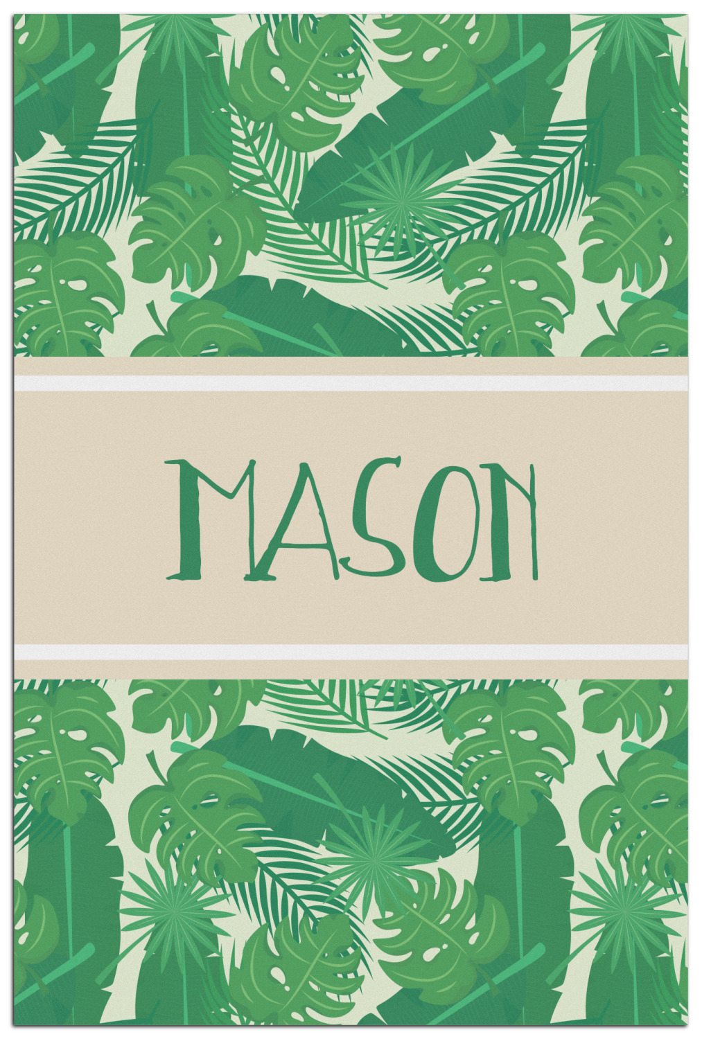 The main design has a cream background with bright green tropical leaves faces every which way. Through the middle of the design sits a cream ribbon, with your personalization on the ribbon itself. Several different kinds of tropical leaves are featured in this fun design.
