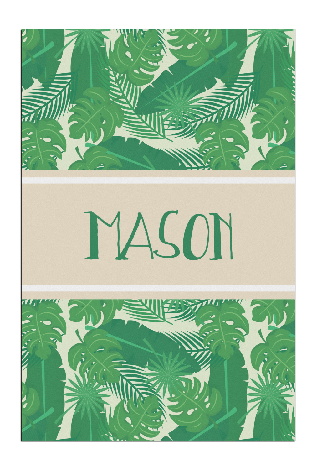 The main design has a cream background with bright green tropical leaves faces every which way. Through the middle of the design sits a cream ribbon, with your personalization on the ribbon itself. Several different kinds of tropical leaves are featured in this fun design.
