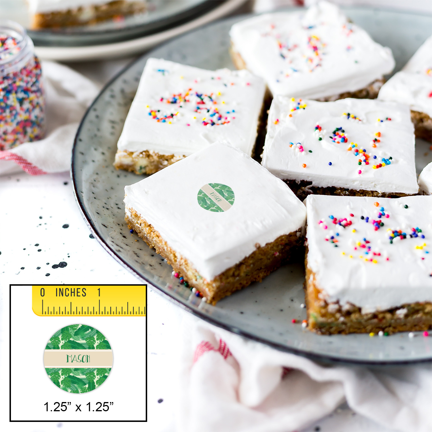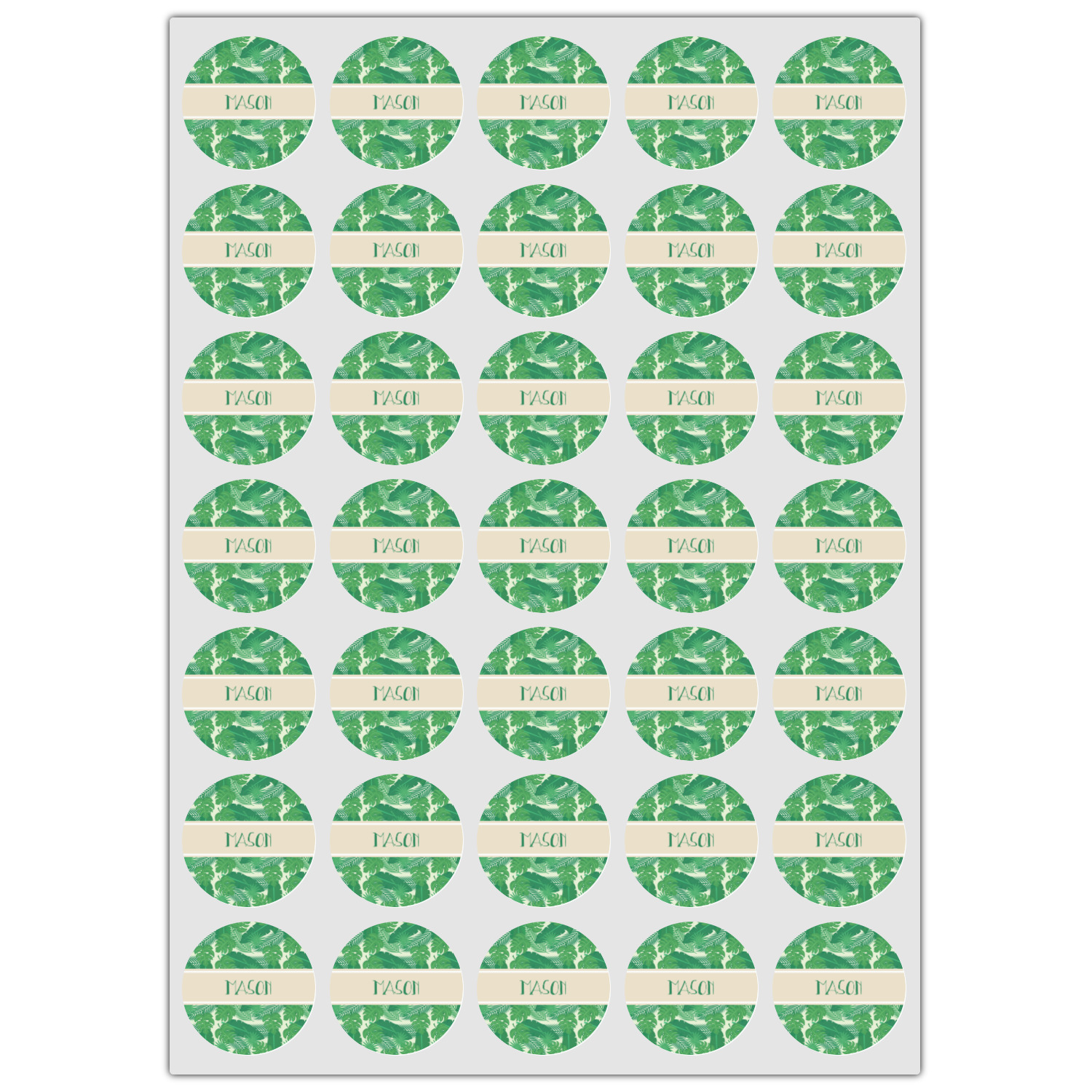 The main design has a cream background with bright green tropical leaves faces every which way. Through the middle of the design sits a cream ribbon, with your personalization on the ribbon itself. Several different kinds of tropical leaves are featured in this fun design.