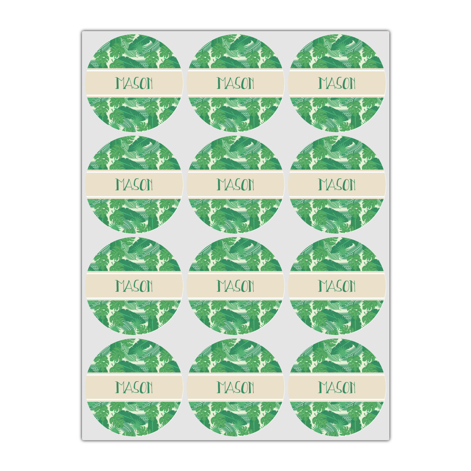 The main design has a cream background with bright green tropical leaves faces every which way. Through the middle of the design sits a cream ribbon, with your personalization on the ribbon itself. Several different kinds of tropical leaves are featured in this fun design.