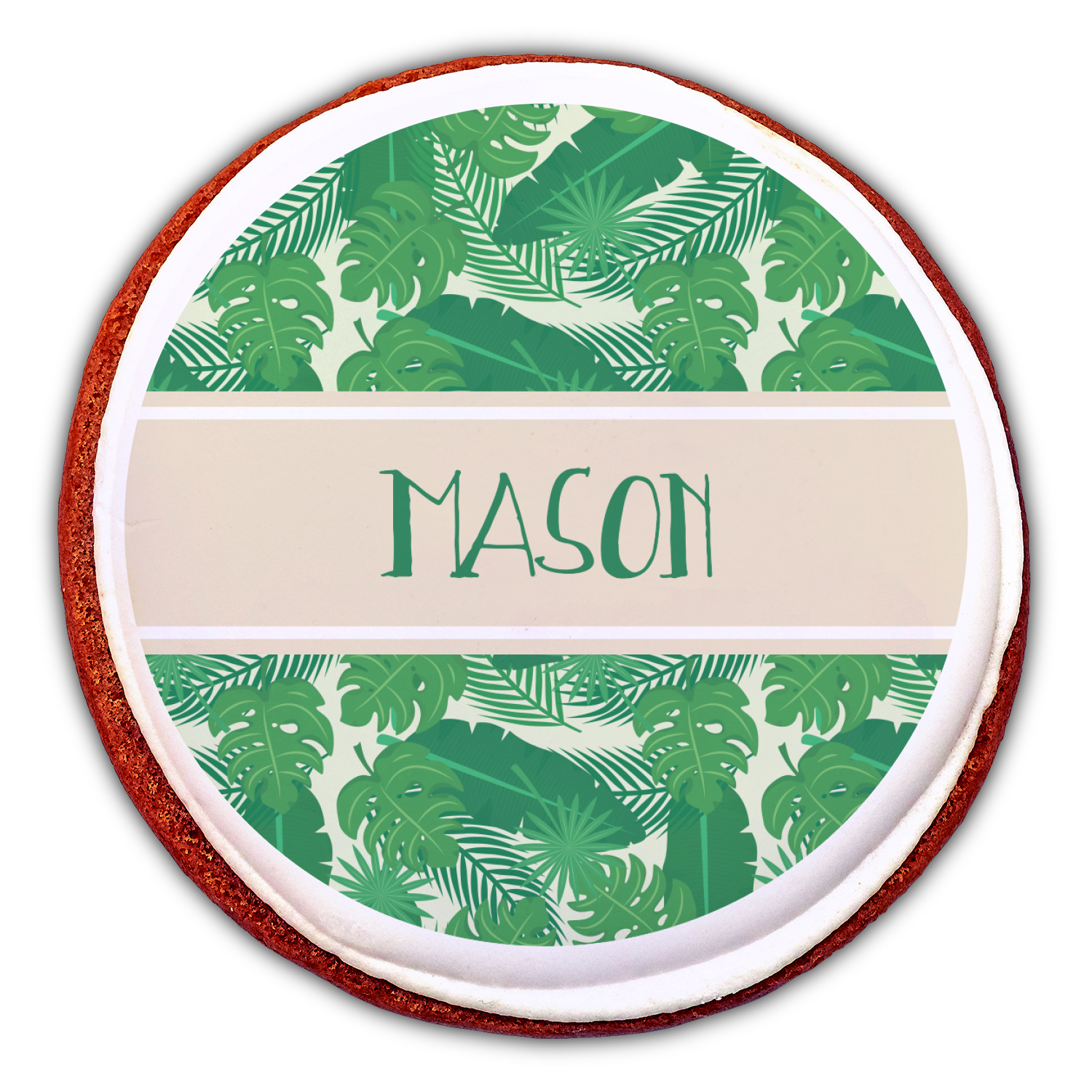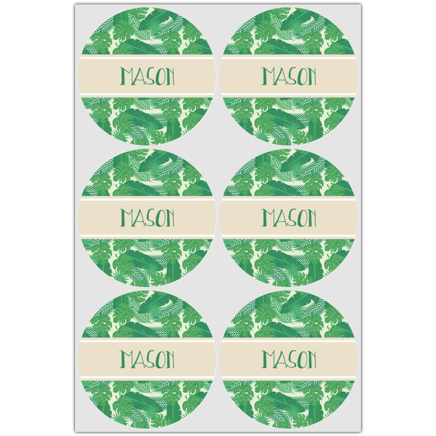 The main design has a cream background with bright green tropical leaves faces every which way. Through the middle of the design sits a cream ribbon, with your personalization on the ribbon itself. Several different kinds of tropical leaves are featured in this fun design.