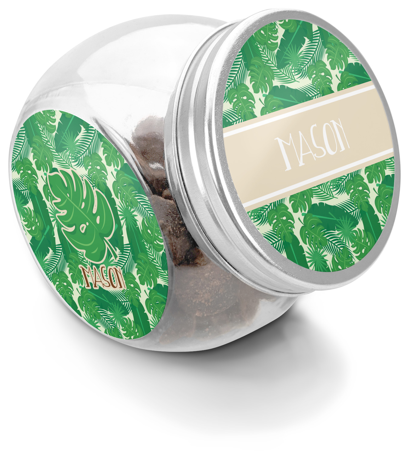 This treat jar is an excellent way to store treats for your favorite canine or feline. Moreover, their delicate, classy appearance makes them a tasteful addition to your countertop's décor. Crafted from clear glass, its unique construction and silver metal, screw-on lid allows for quick and easy access. Three, permanent, vinyl stickers are applied to both sides of the jar and lid, presenting your personalized design. The base of this glass, dog treat jar is 3.4" x 4.75", and the jar stands at 5" tall. Though on the smaller side, this jar is best suited for smaller treats or training treats.