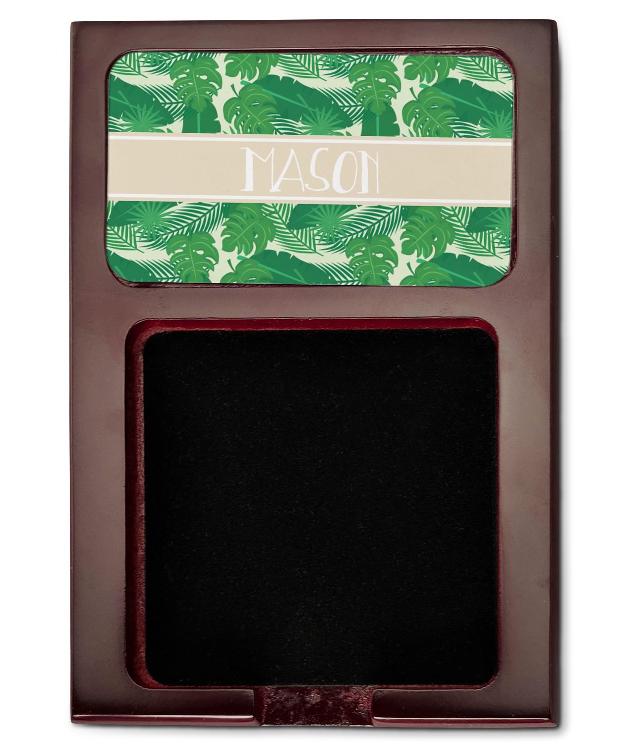 The main design has a cream background with bright green tropical leaves faces every which way. Through the middle of the design sits a cream ribbon, with your personalization on the ribbon itself. Several different kinds of tropical leaves are featured in this fun design.