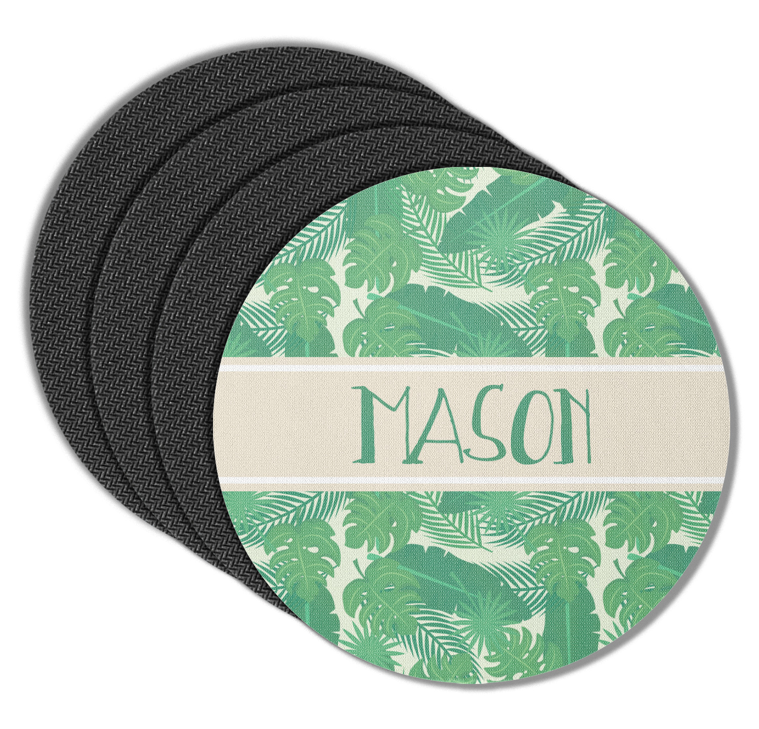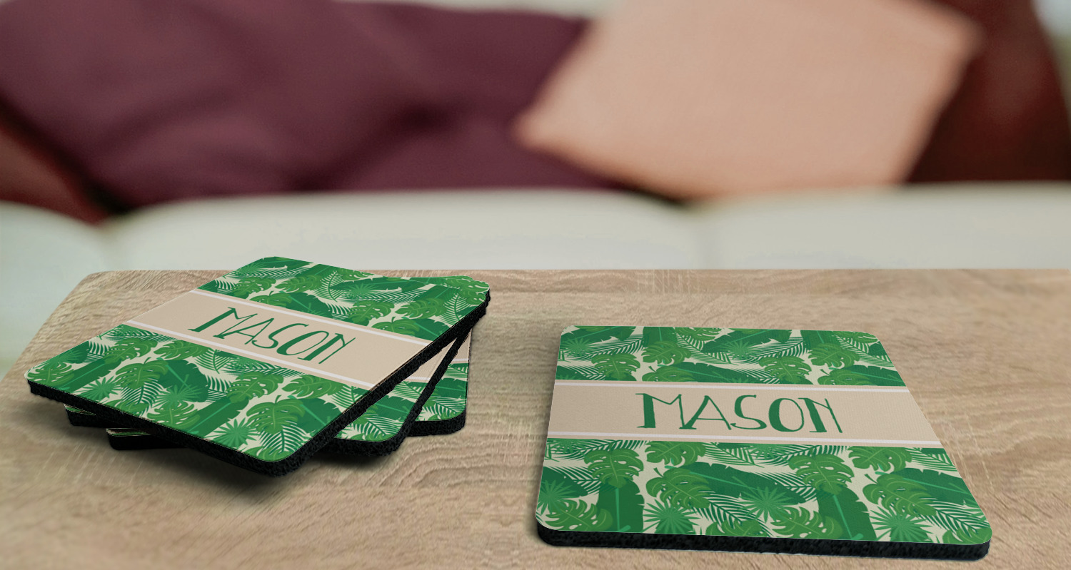 These drink coasters have a smooth, polyester top and a textured, rubber backing on its bottom. The non-slip rubber backing underneath works to keep any spills at bay. At 4 by 4 by 0.25 inches thick, these custom coasters are a suitable size for most drinkware. Your personalization is displayed atop the face of the cup coaster. We sell these rubber coasters in two different shapes: square and round. You can buy each shape as singulars or as a set of 4.