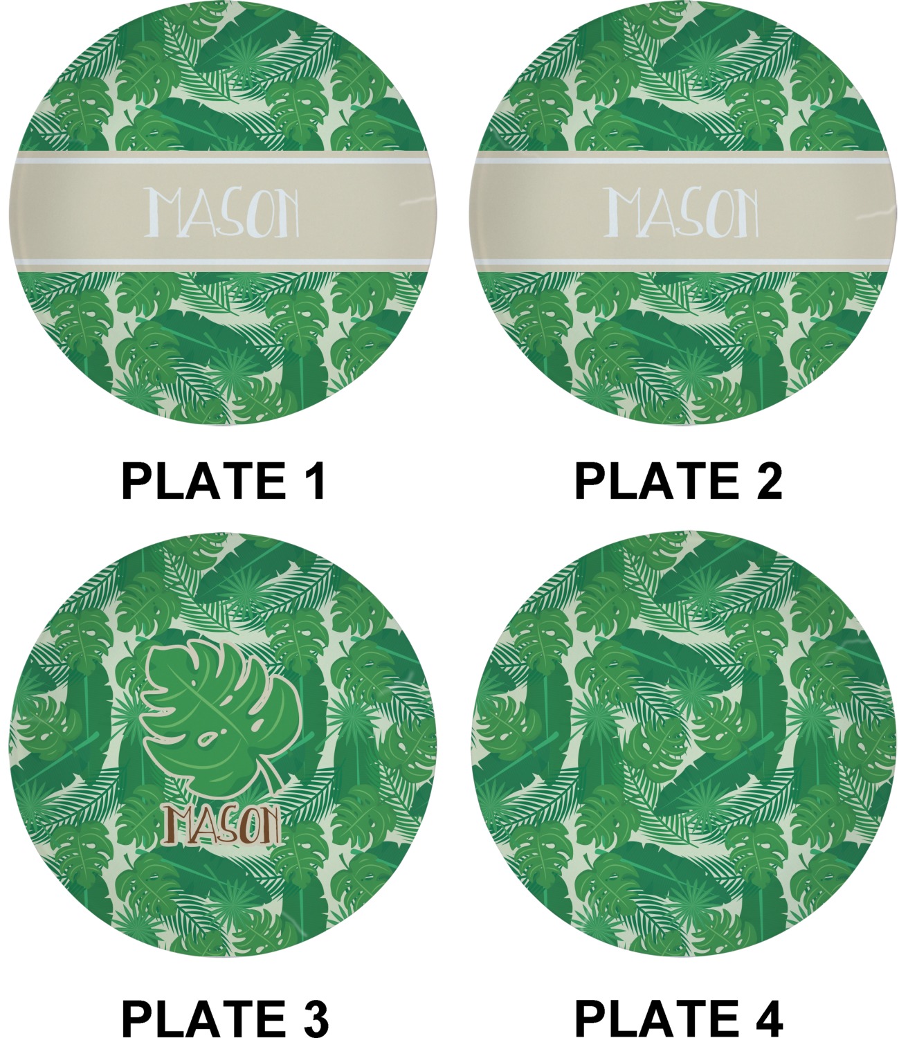 The main design has a cream background with bright green tropical leaves faces every which way. Through the middle of the design sits a cream ribbon, with your personalization on the ribbon itself. Several different kinds of tropical leaves are featured in this fun design.