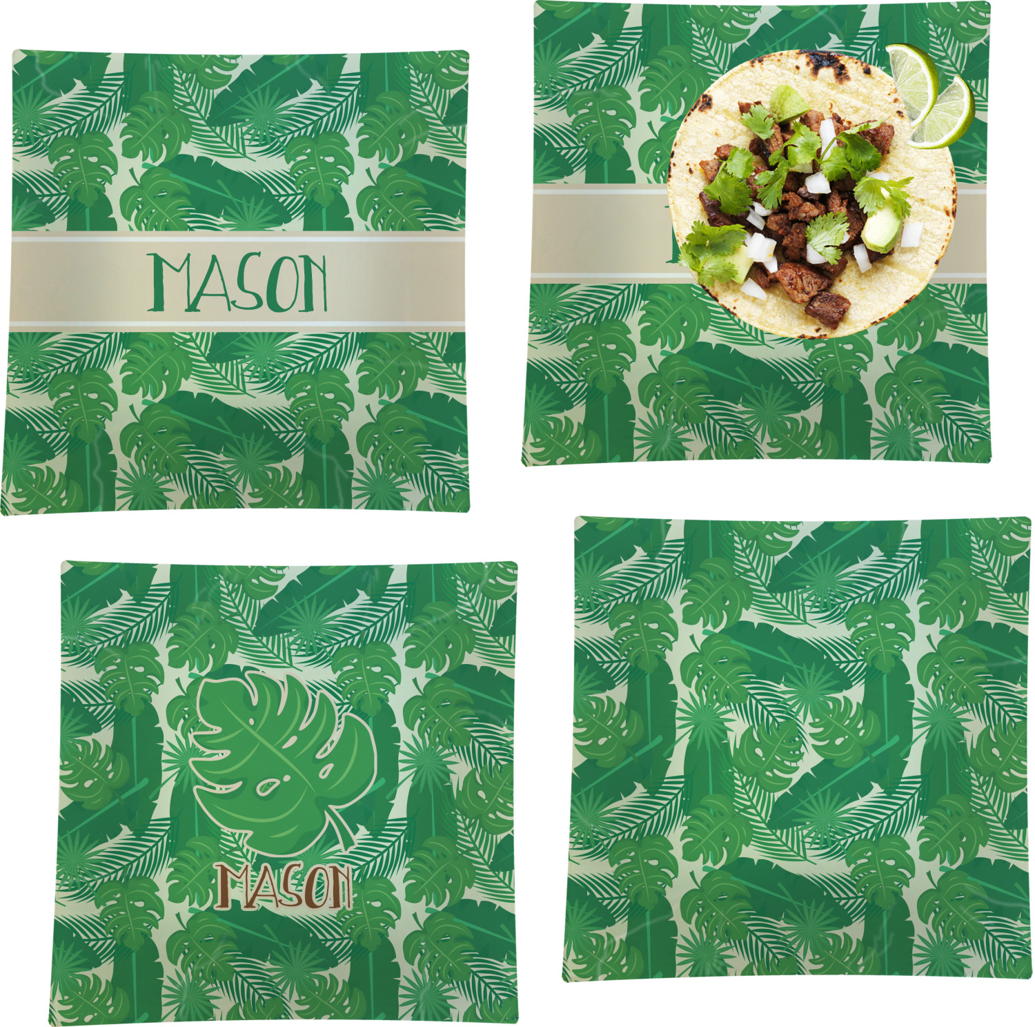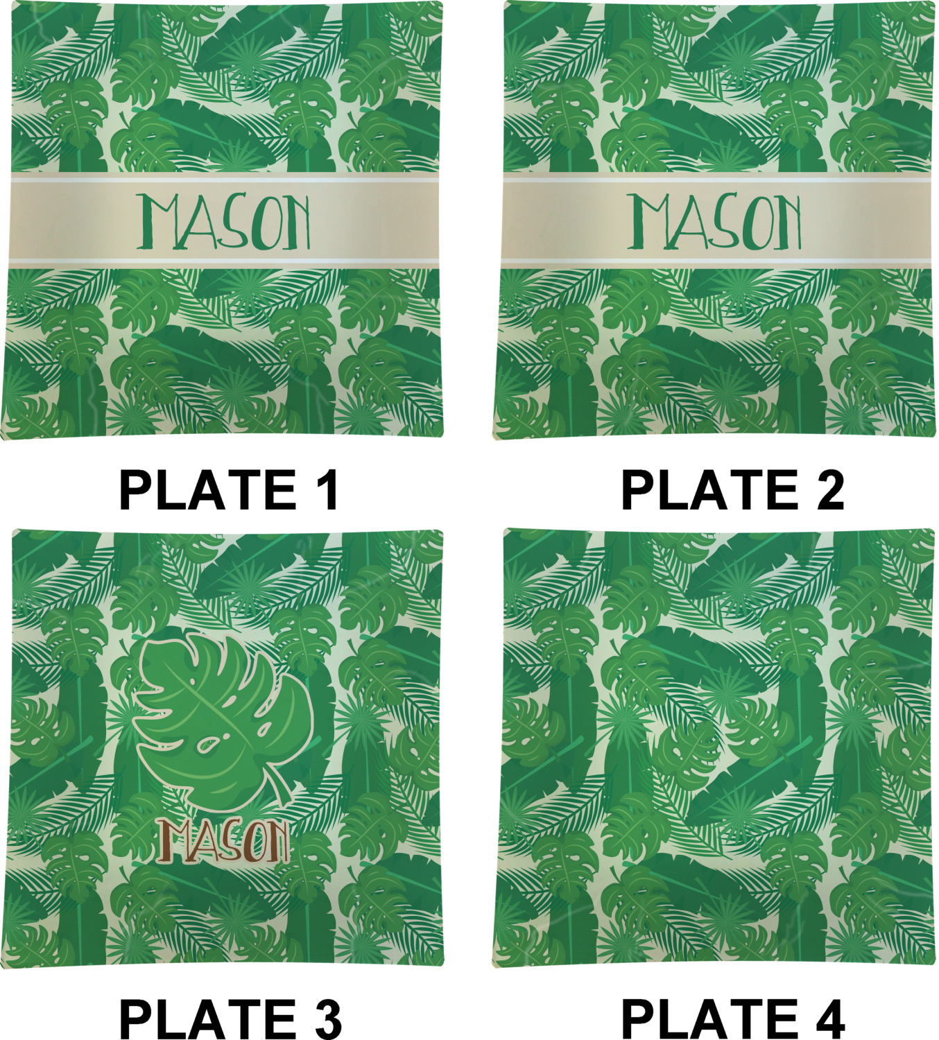 The main design has a cream background with bright green tropical leaves faces every which way. Through the middle of the design sits a cream ribbon, with your personalization on the ribbon itself. Several different kinds of tropical leaves are featured in this fun design.