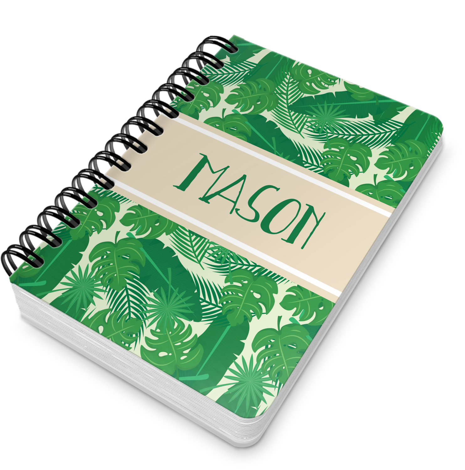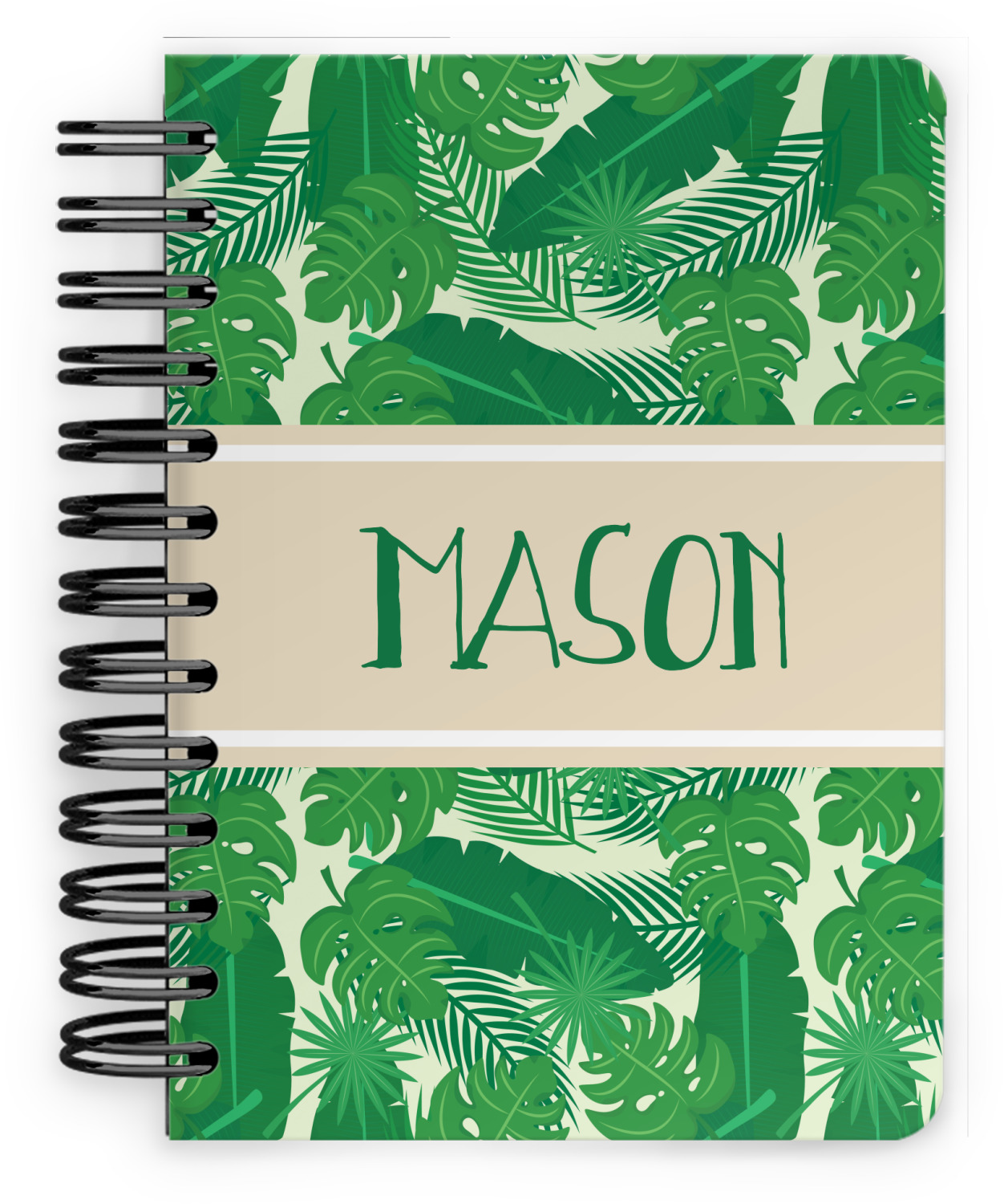 The main design has a cream background with bright green tropical leaves faces every which way. Through the middle of the design sits a cream ribbon, with your personalization on the ribbon itself. Several different kinds of tropical leaves are featured in this fun design.