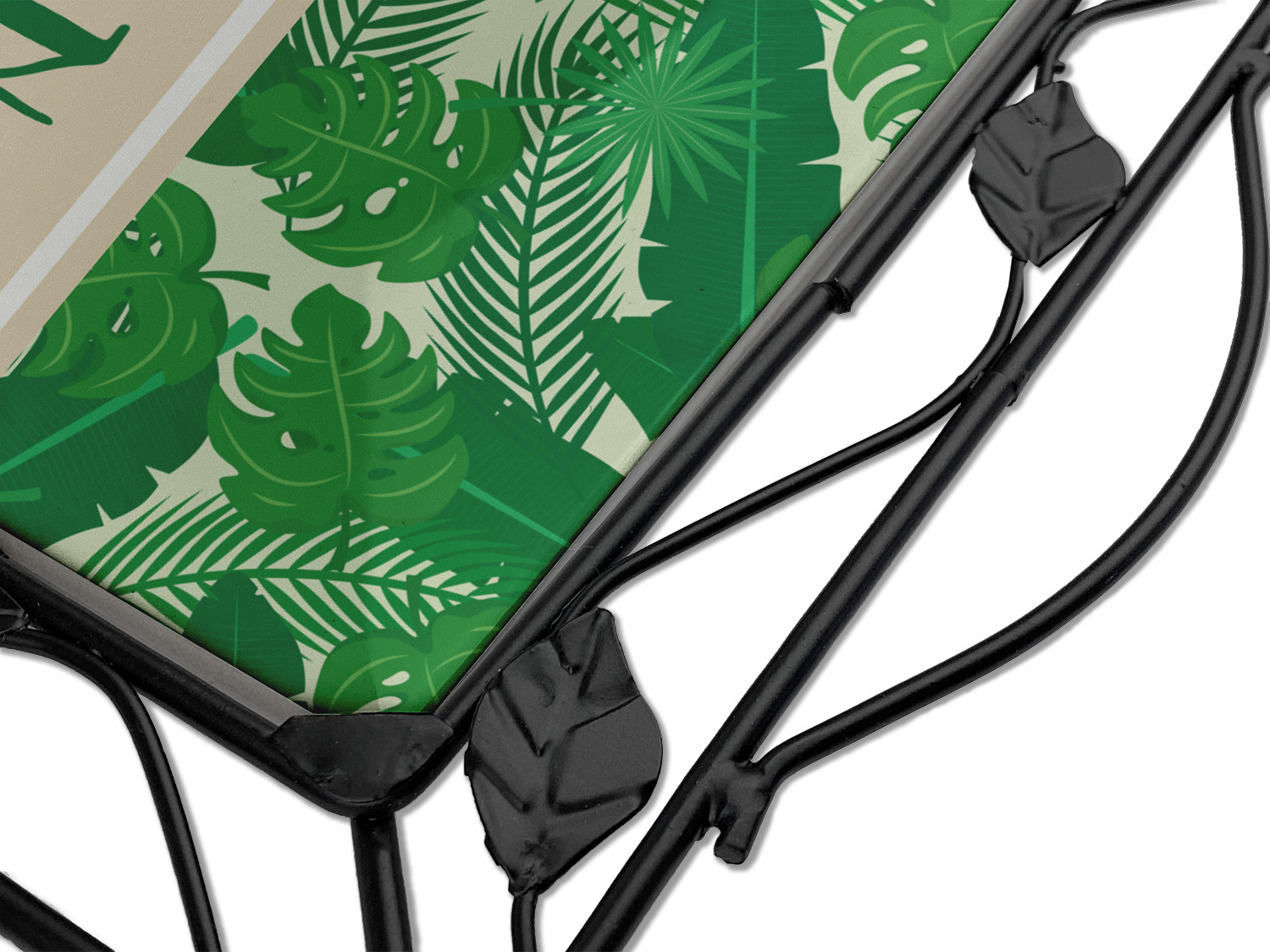The main design has a cream background with bright green tropical leaves faces every which way. Through the middle of the design sits a cream ribbon, with your personalization on the ribbon itself. Several different kinds of tropical leaves are featured in this fun design.