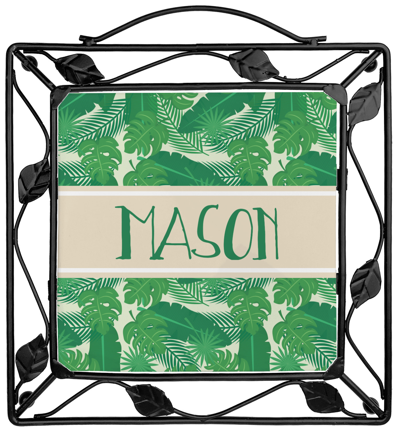 Our square trivets are made from a durable, wrought iron. This model features 4 small half circles, one on each corner, and a larger ring of iron that circles the central, customized tile. Each of the 4 corners has a round foot on its bottom for stability. This trivet is 8.75 by 8.75 inches, but the central tile measures at 6 inches on both sides.