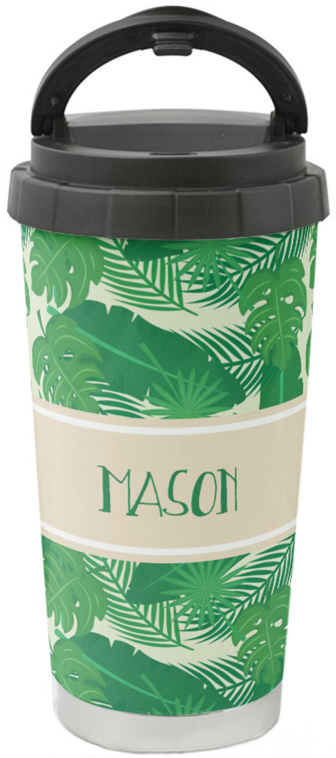 The main design has a cream background with bright green tropical leaves faces every which way. Through the middle of the design sits a cream ribbon, with your personalization on the ribbon itself. Several different kinds of tropical leaves are featured in this fun design.