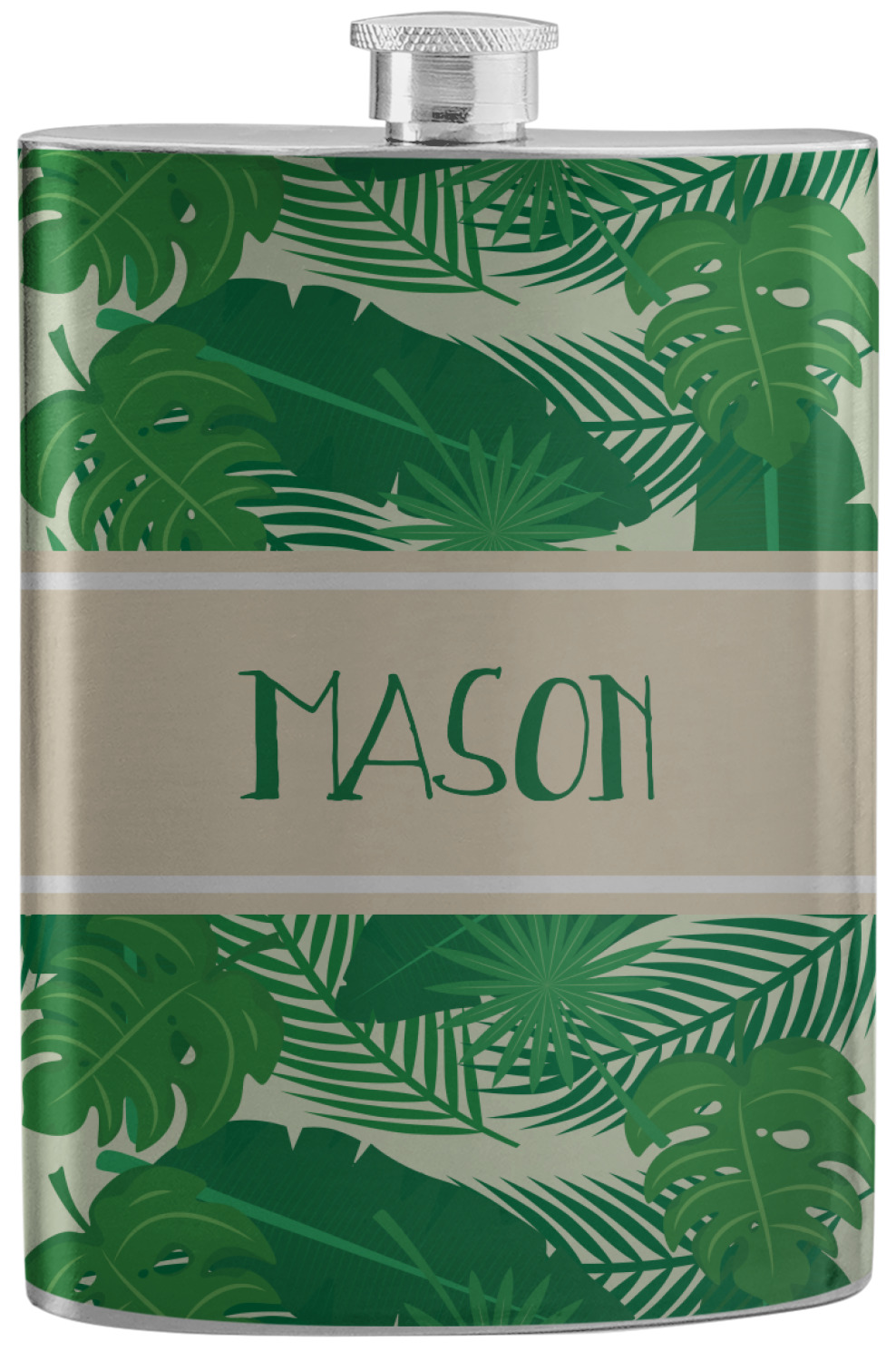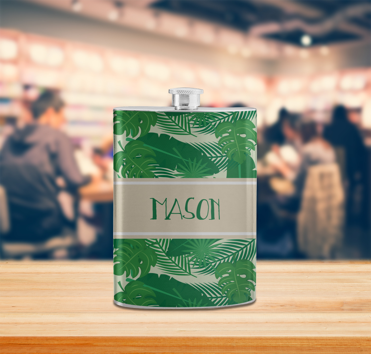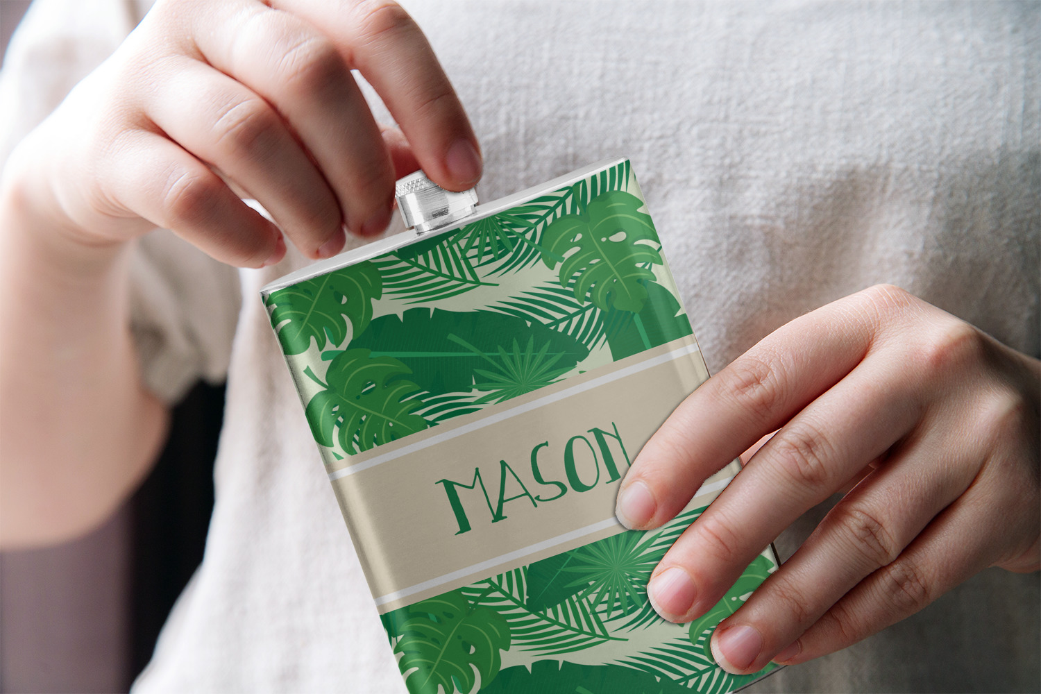 The main design has a cream background with bright green tropical leaves faces every which way. Through the middle of the design sits a cream ribbon, with your personalization on the ribbon itself. Several different kinds of tropical leaves are featured in this fun design.