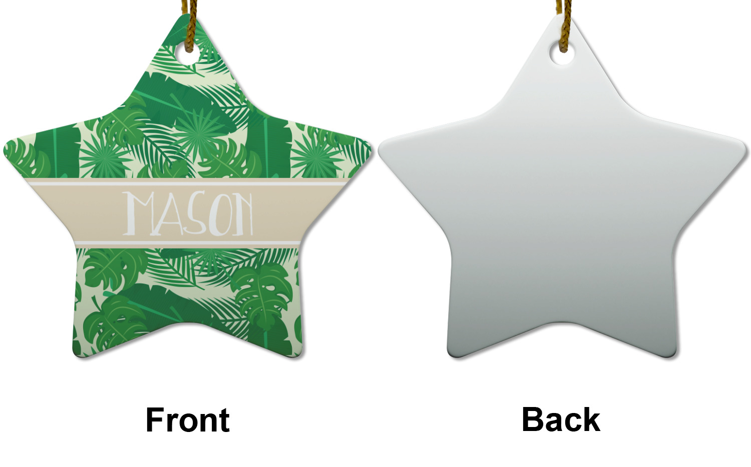 The main design has a cream background with bright green tropical leaves faces every which way. Through the middle of the design sits a cream ribbon, with your personalization on the ribbon itself. Several different kinds of tropical leaves are featured in this fun design.