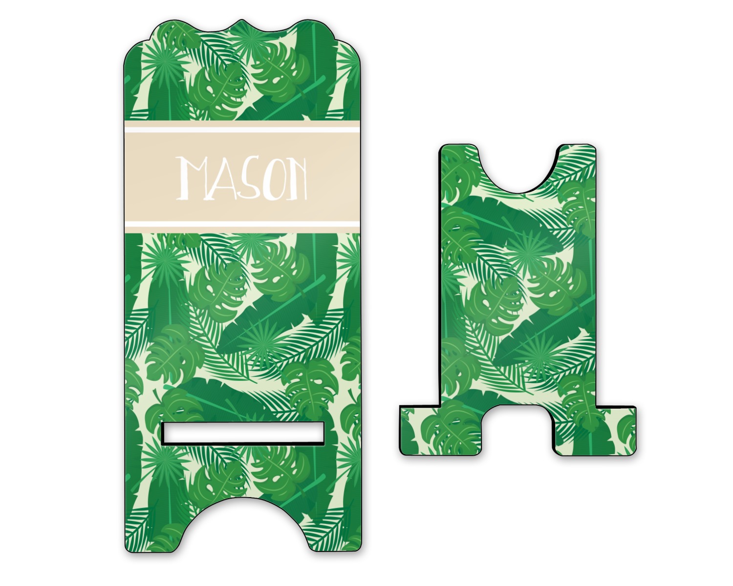 The main design has a cream background with bright green tropical leaves faces every which way. Through the middle of the design sits a cream ribbon, with your personalization on the ribbon itself. Several different kinds of tropical leaves are featured in this fun design.
