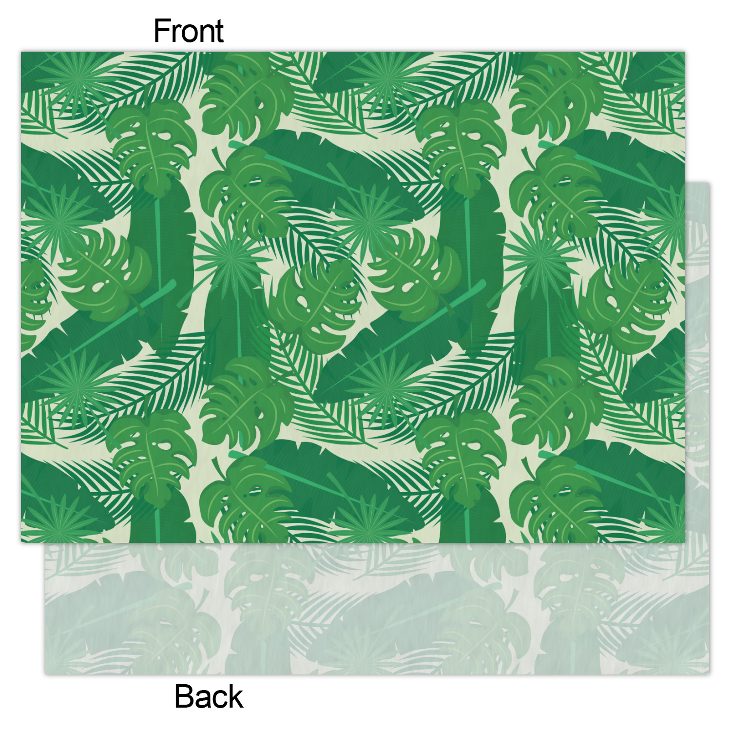 The main design has a cream background with bright green tropical leaves faces every which way. Through the middle of the design sits a cream ribbon, with your personalization on the ribbon itself. Several different kinds of tropical leaves are featured in this fun design.