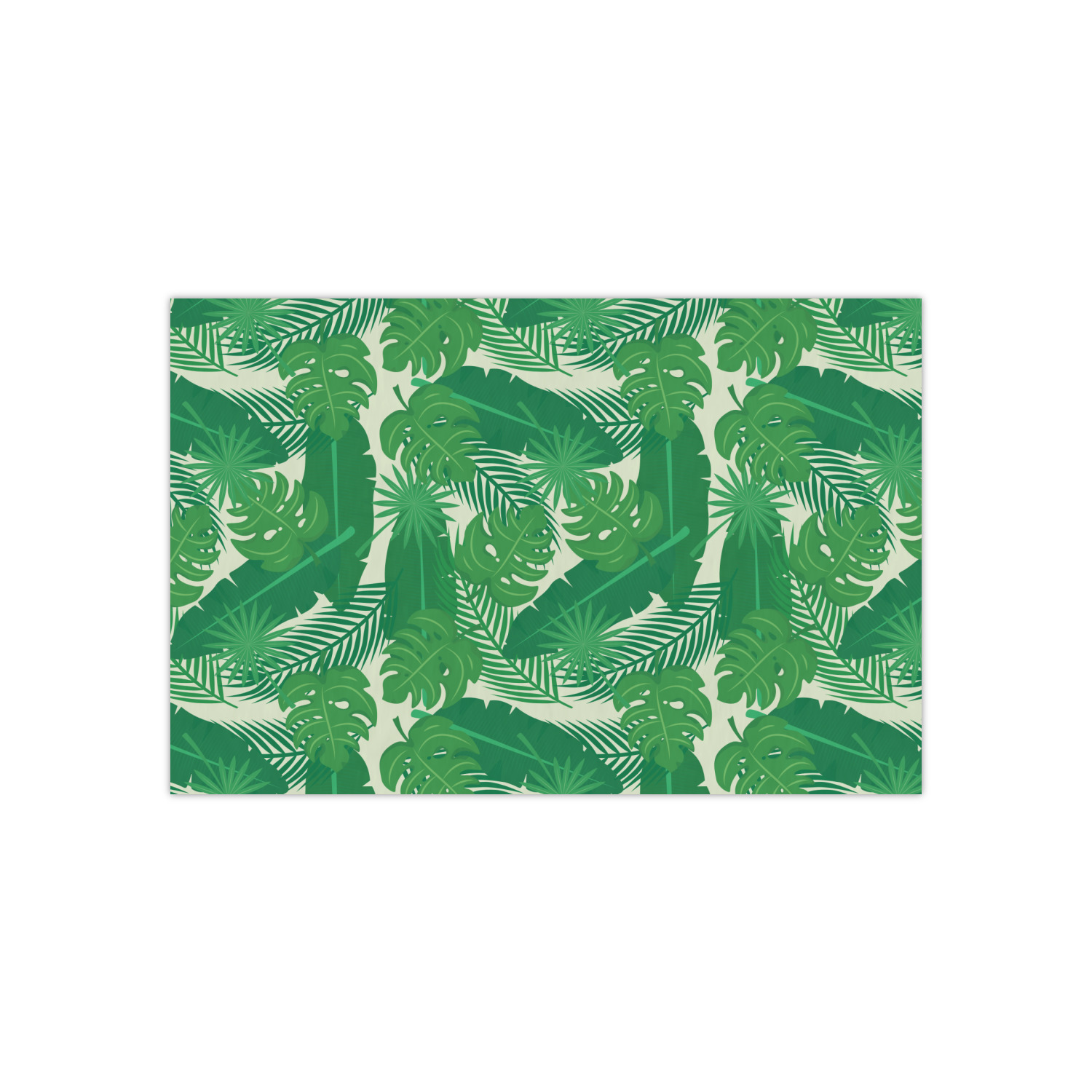 The main design has a cream background with bright green tropical leaves faces every which way. Through the middle of the design sits a cream ribbon, with your personalization on the ribbon itself. Several different kinds of tropical leaves are featured in this fun design.