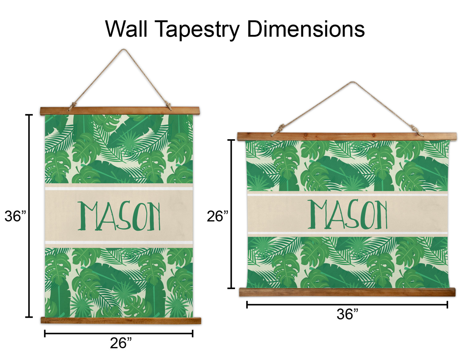 Made in two different orientations - portrait or landscape - both are 26" x 36". Your design is printed on a high quality polyester fabric with hemmed edges. The wood on the top and bottom of the tapestry is 1.25" tall and 0.25" thick and there are two pieces on top and bottom which sandwich the fabric.