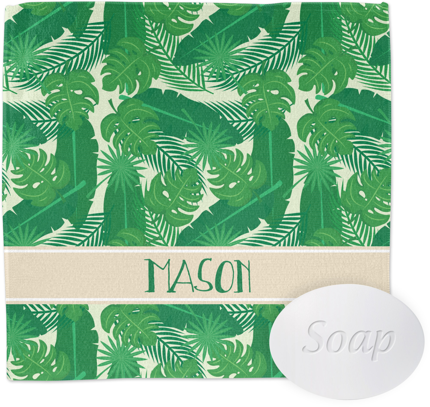 The main design has a cream background with bright green tropical leaves faces every which way. Through the middle of the design sits a cream ribbon, with your personalization on the ribbon itself. Several different kinds of tropical leaves are featured in this fun design.
