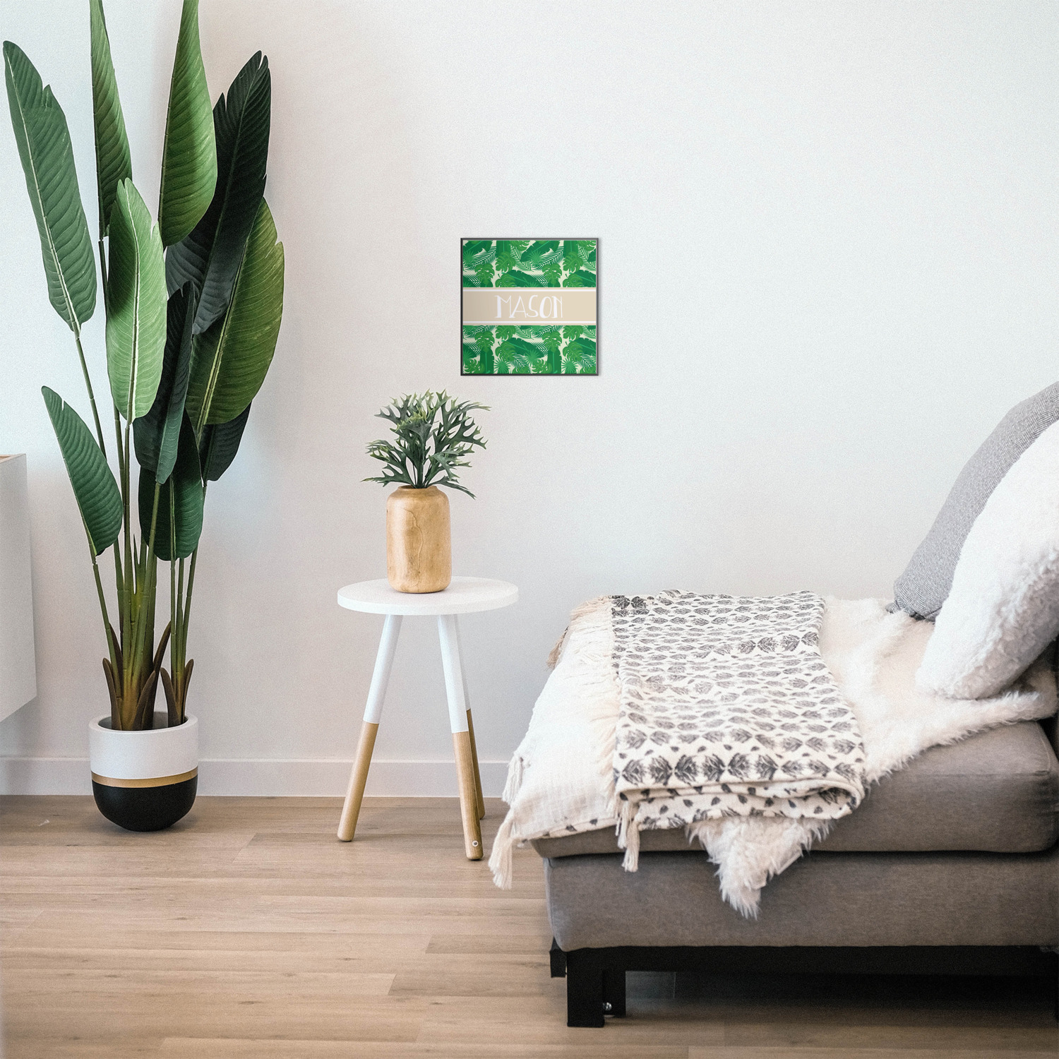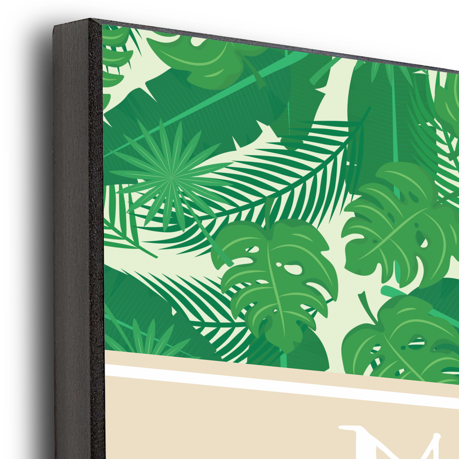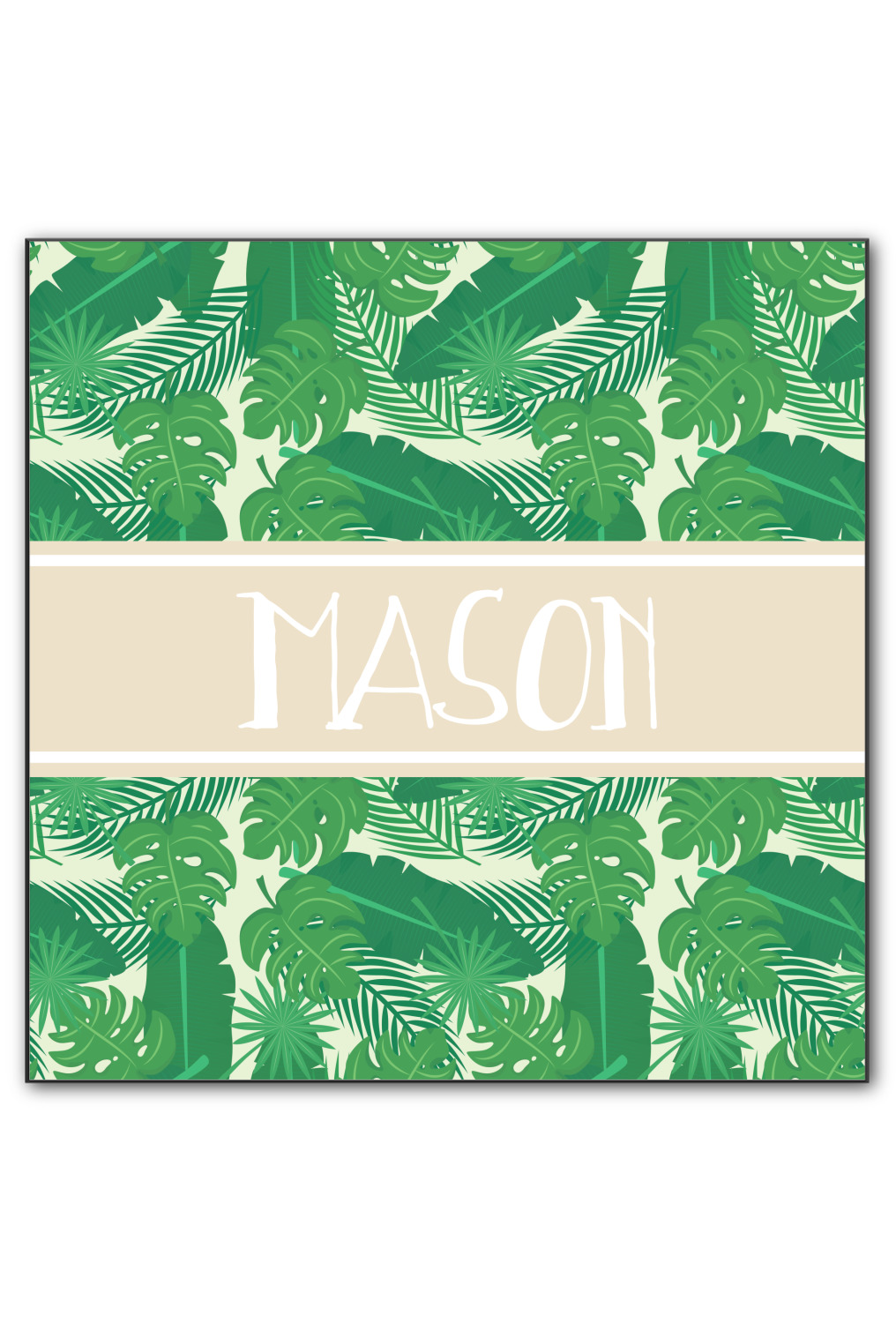 The main design has a cream background with bright green tropical leaves faces every which way. Through the middle of the design sits a cream ribbon, with your personalization on the ribbon itself. Several different kinds of tropical leaves are featured in this fun design.