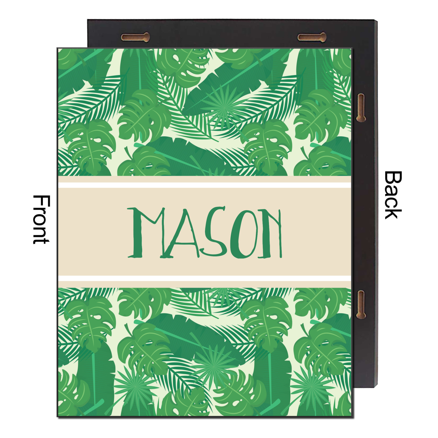 The main design has a cream background with bright green tropical leaves faces every which way. Through the middle of the design sits a cream ribbon, with your personalization on the ribbon itself. Several different kinds of tropical leaves are featured in this fun design.