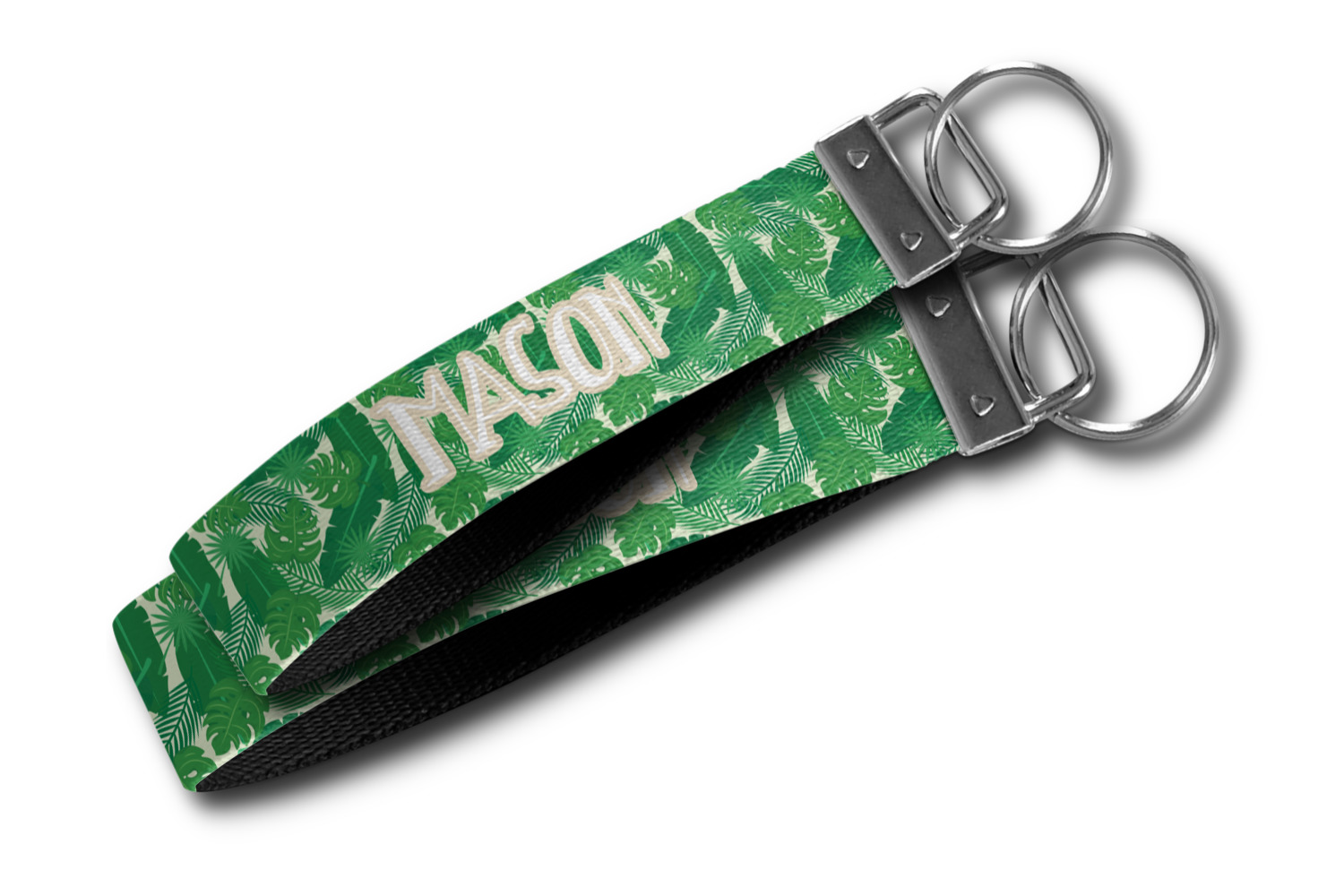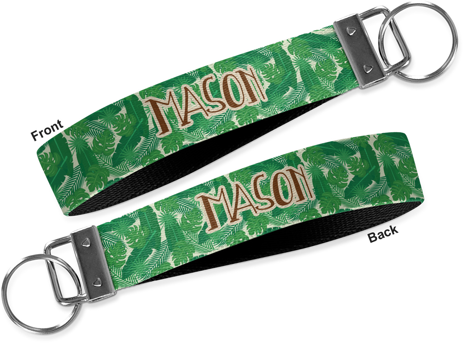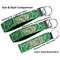 These key fob keychains are made from a polyester weave, right here in the USA. They feature a silver, metal clasp, attached to a round keyring. The piece gives the personalized wristlet a beautiful, finished look. Your customized design is printed on the outside of the keychain strap. We carry these wristlets in two sizes: small, which is 5 inches in width, and large, which is 5.5 inches in width.