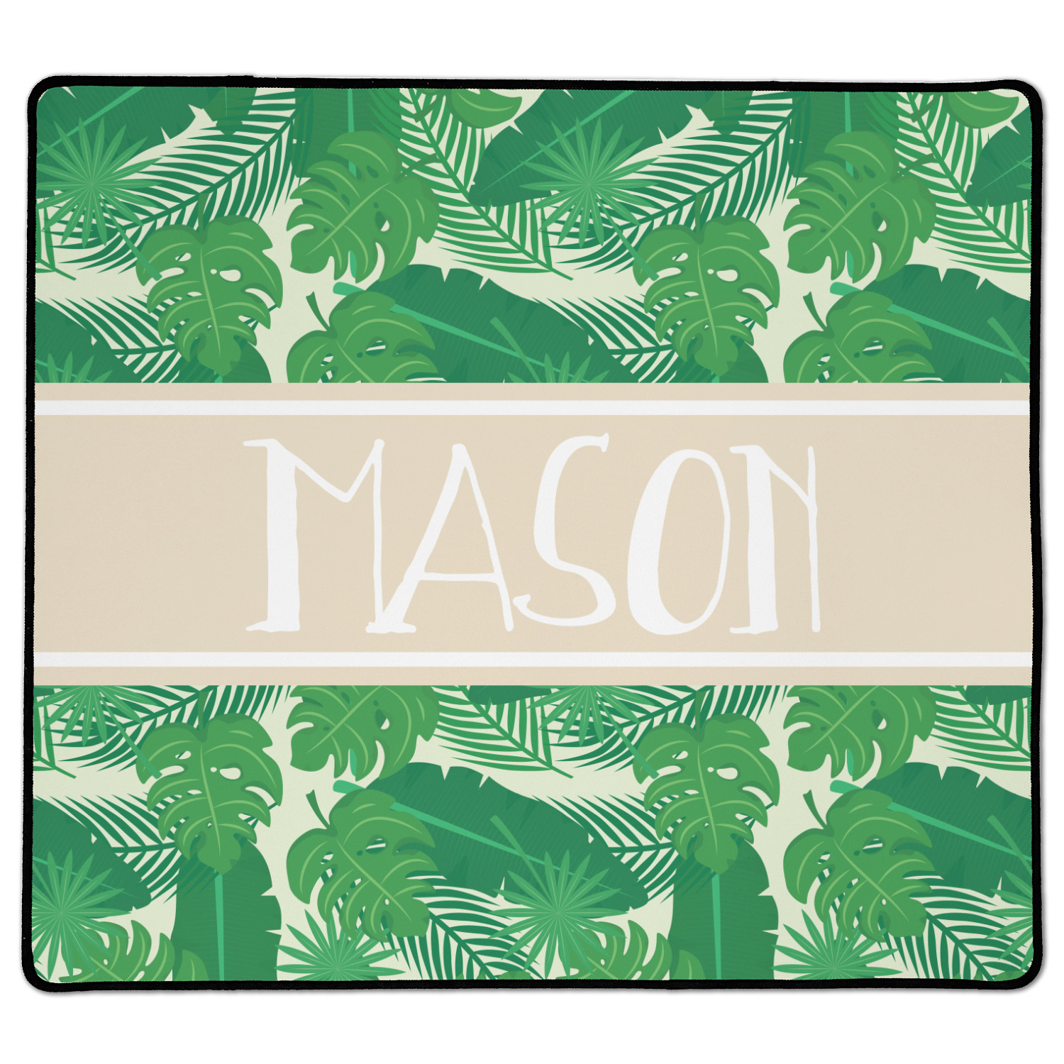 The main design has a cream background with bright green tropical leaves faces every which way. Through the middle of the design sits a cream ribbon, with your personalization on the ribbon itself. Several different kinds of tropical leaves are featured in this fun design.
