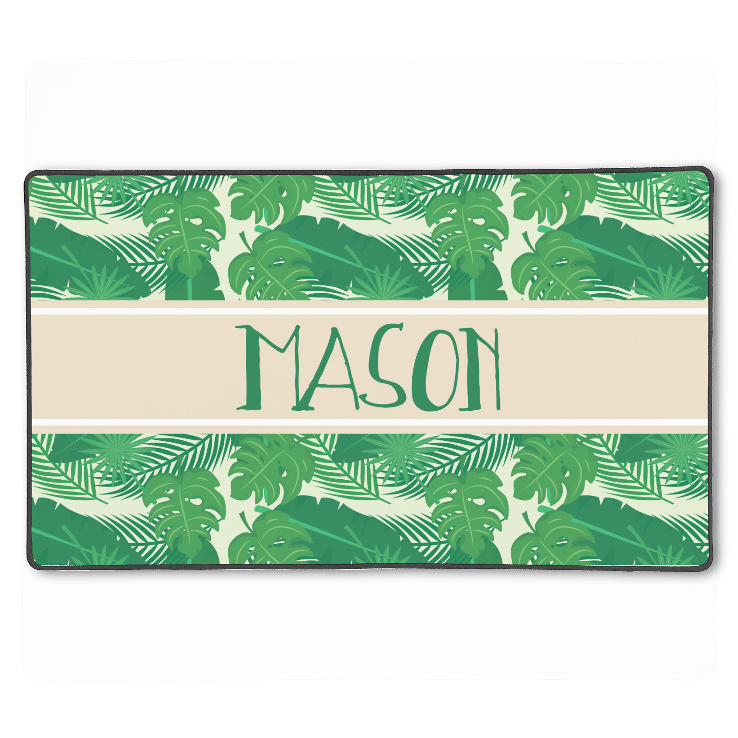 The main design has a cream background with bright green tropical leaves faces every which way. Through the middle of the design sits a cream ribbon, with your personalization on the ribbon itself. Several different kinds of tropical leaves are featured in this fun design.