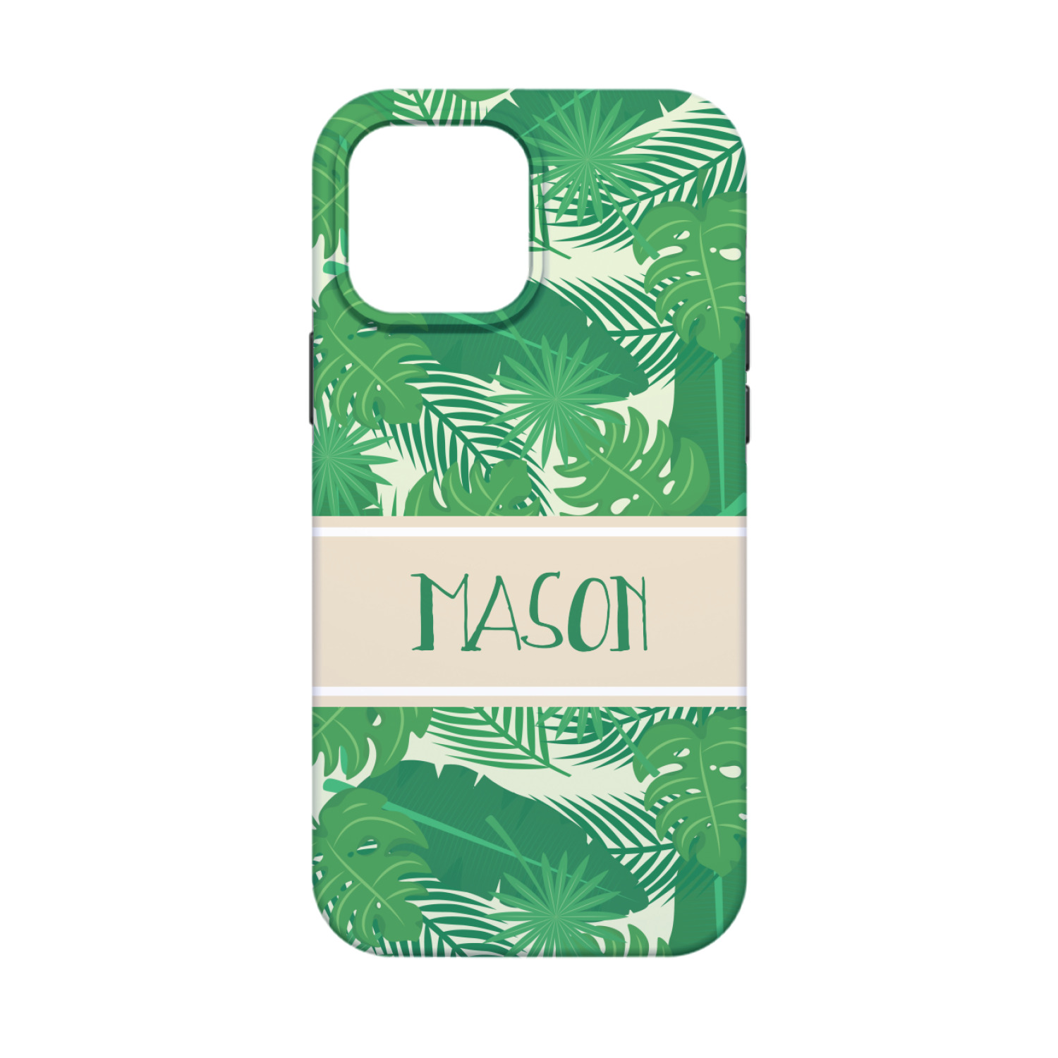 The main design has a cream background with bright green tropical leaves faces every which way. Through the middle of the design sits a cream ribbon, with your personalization on the ribbon itself. Several different kinds of tropical leaves are featured in this fun design.