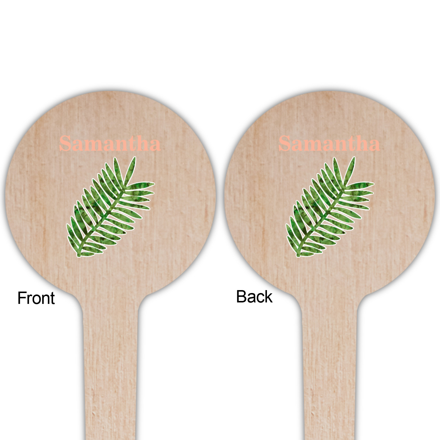 The background of the main design is filled with thin tropical leaves scattered about. The leaves are filled with a dark green watercolor texture. The ribbon and scalloped frame are filled with a light peach watercolor texture. The monogram in the middle gives an extra feminine touch to this design.