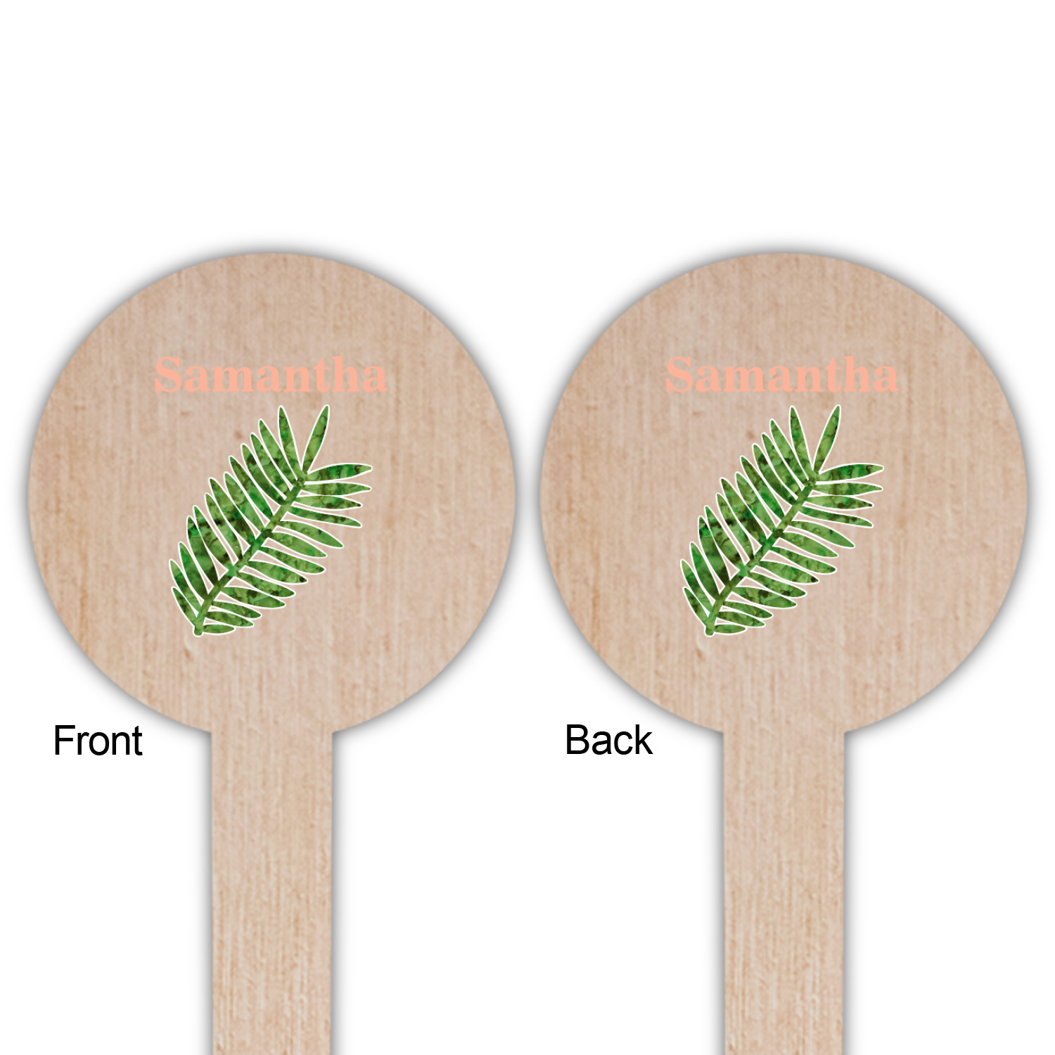 The background of the main design is filled with thin tropical leaves scattered about. The leaves are filled with a dark green watercolor texture. The ribbon and scalloped frame are filled with a light peach watercolor texture. The monogram in the middle gives an extra feminine touch to this design.