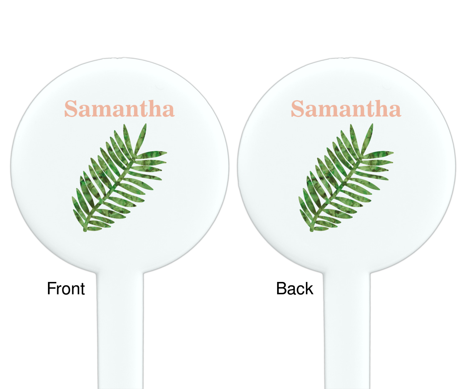 The background of the main design is filled with thin tropical leaves scattered about. The leaves are filled with a dark green watercolor texture. The ribbon and scalloped frame are filled with a light peach watercolor texture. The monogram in the middle gives an extra feminine touch to this design.
