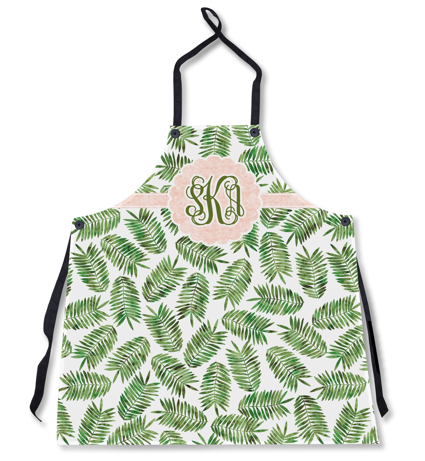 The background of the main design is filled with thin tropical leaves scattered about. The leaves are filled with a dark green watercolor texture. The ribbon and scalloped frame are filled with a light peach watercolor texture. The monogram in the middle gives an extra feminine touch to this design.