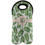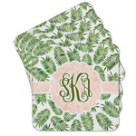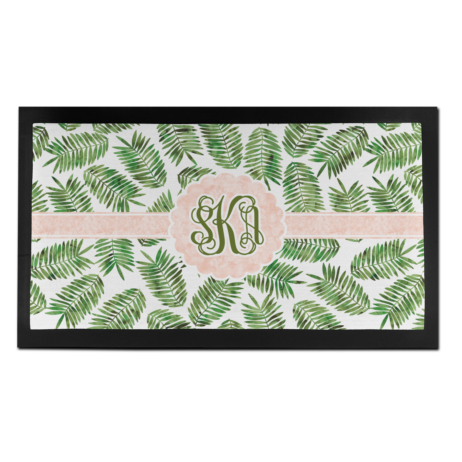 The background of the main design is filled with thin tropical leaves scattered about. The leaves are filled with a dark green watercolor texture. The ribbon and scalloped frame are filled with a light peach watercolor texture. The monogram in the middle gives an extra feminine touch to this design.